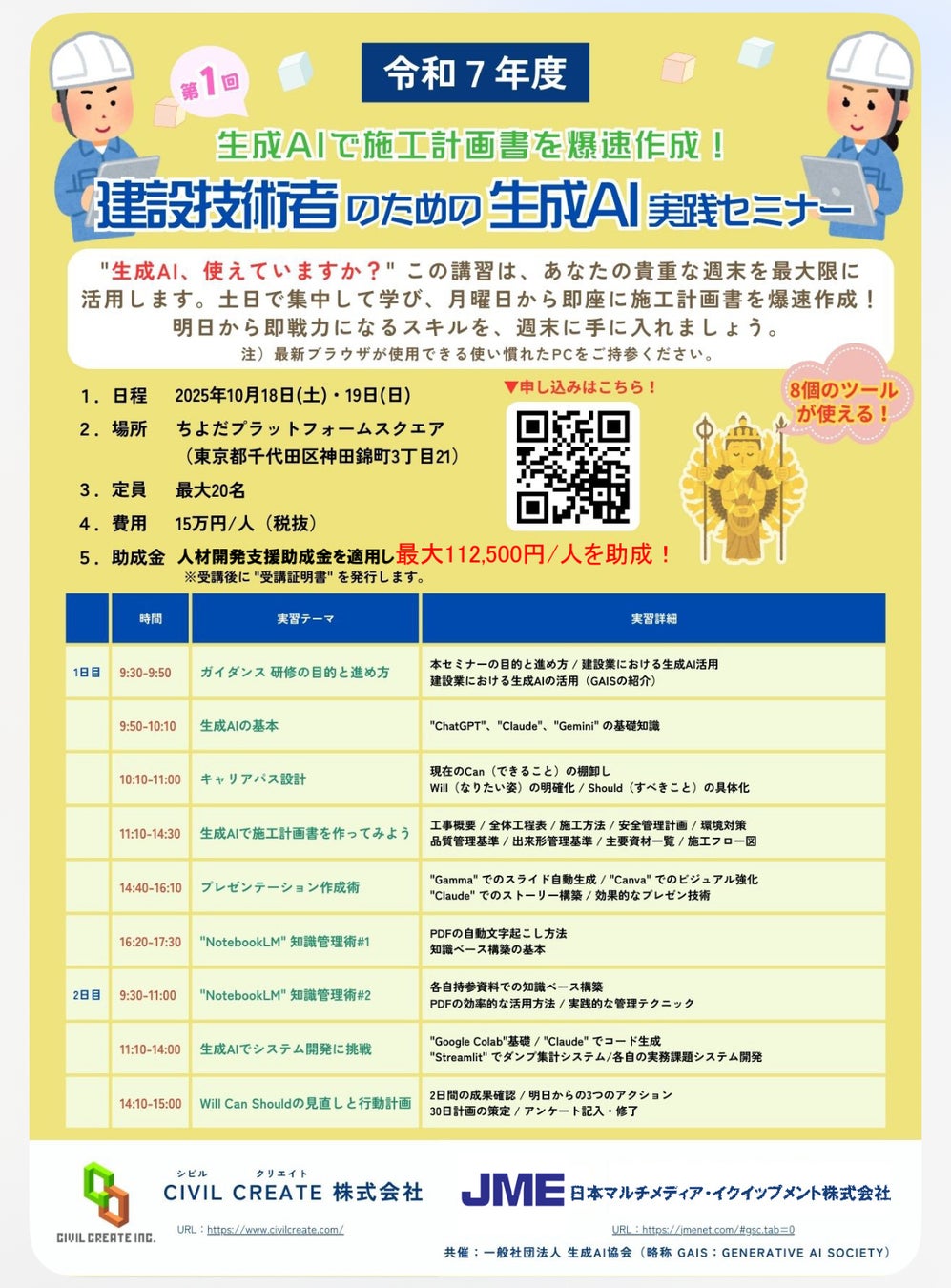 建設業界に特化した生成AI活用の実践セミナー「生成AIで施工計画書を爆速作成!建設技術者のための生成AI実践セミナー」が、2025年10月18日(土)・19日(日)の2日間、東京都千代田区にて開催されます。本セミナーは、一般社団法人 生成AI活用普及協会(GAIS)の法人会員であるCIVIL CREATE株式会社と日本マルチメディア・イクイップメント株式会社、そしてGAISの三者共催により開催され、現場で即活用できる生成AIのスキルを短期間で習得できる内容となっています。