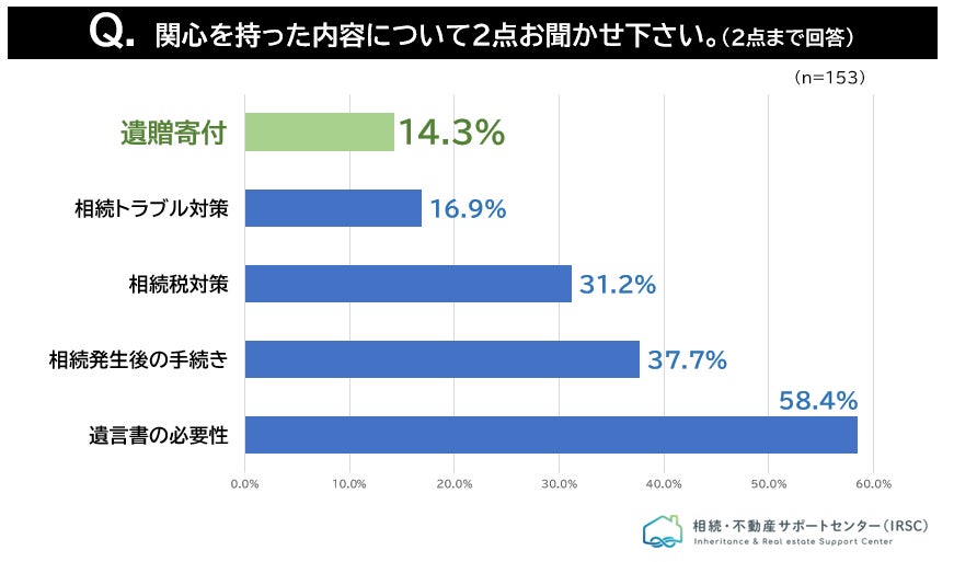 セミナー参加者の7人に1人(14.3%)が「遺贈寄付」に関心を表明。自治体との連携による適切な情報提供が、シニア世代の社会貢献意欲を呼び起こす有効な一石となることが示唆されました。