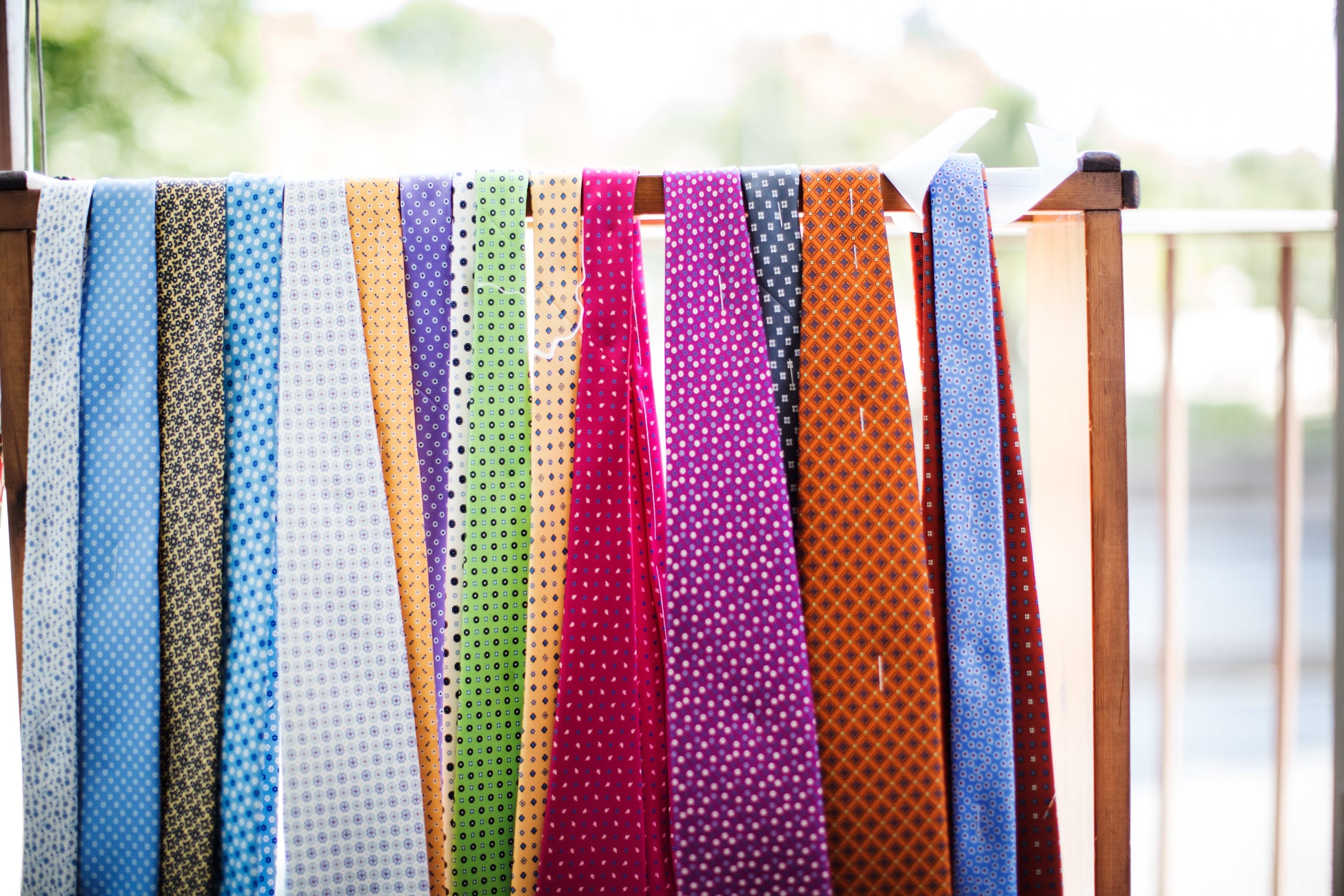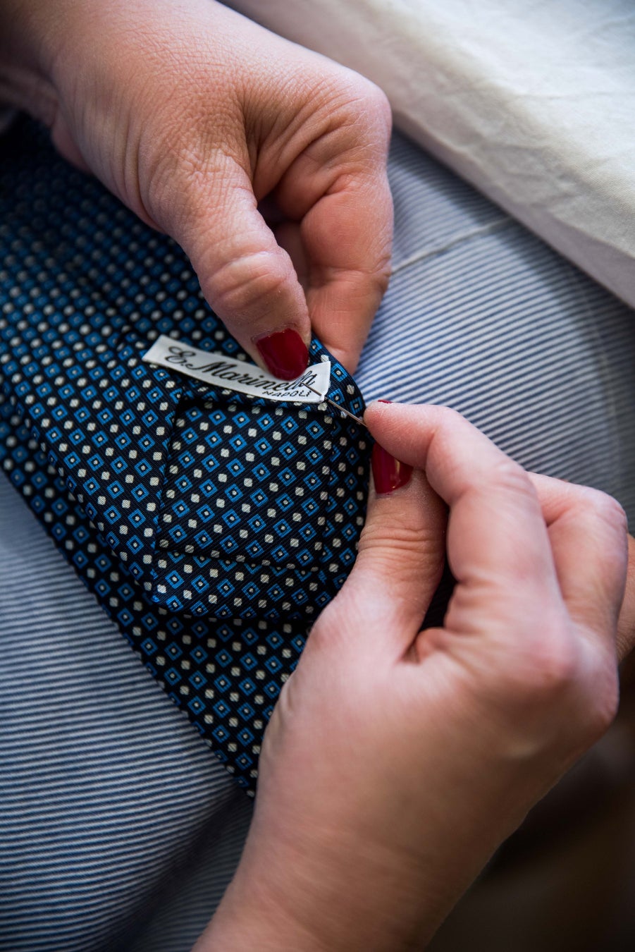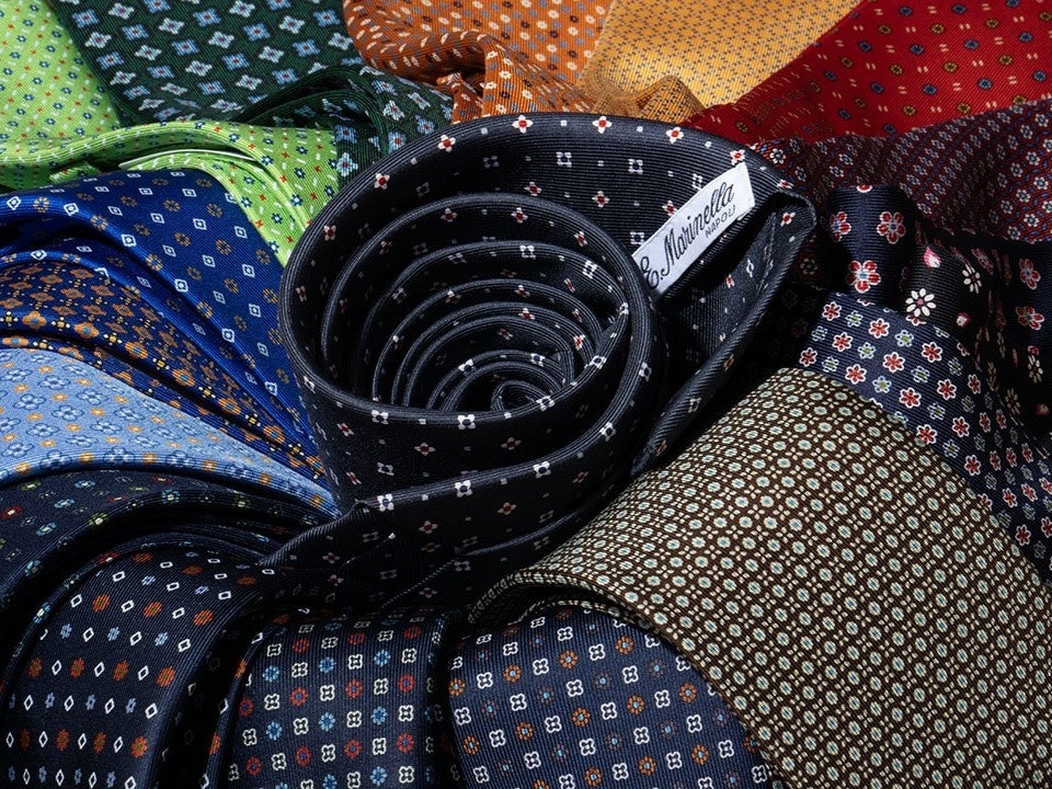 1枚の生地を7回折り込んで作られる美しいネクタイは、結びやすく、立体的なドレープが特徴です。この「セッテピエゲ」の技術が、今日まで続く精巧な仕立てのネクタイの基礎となりました。