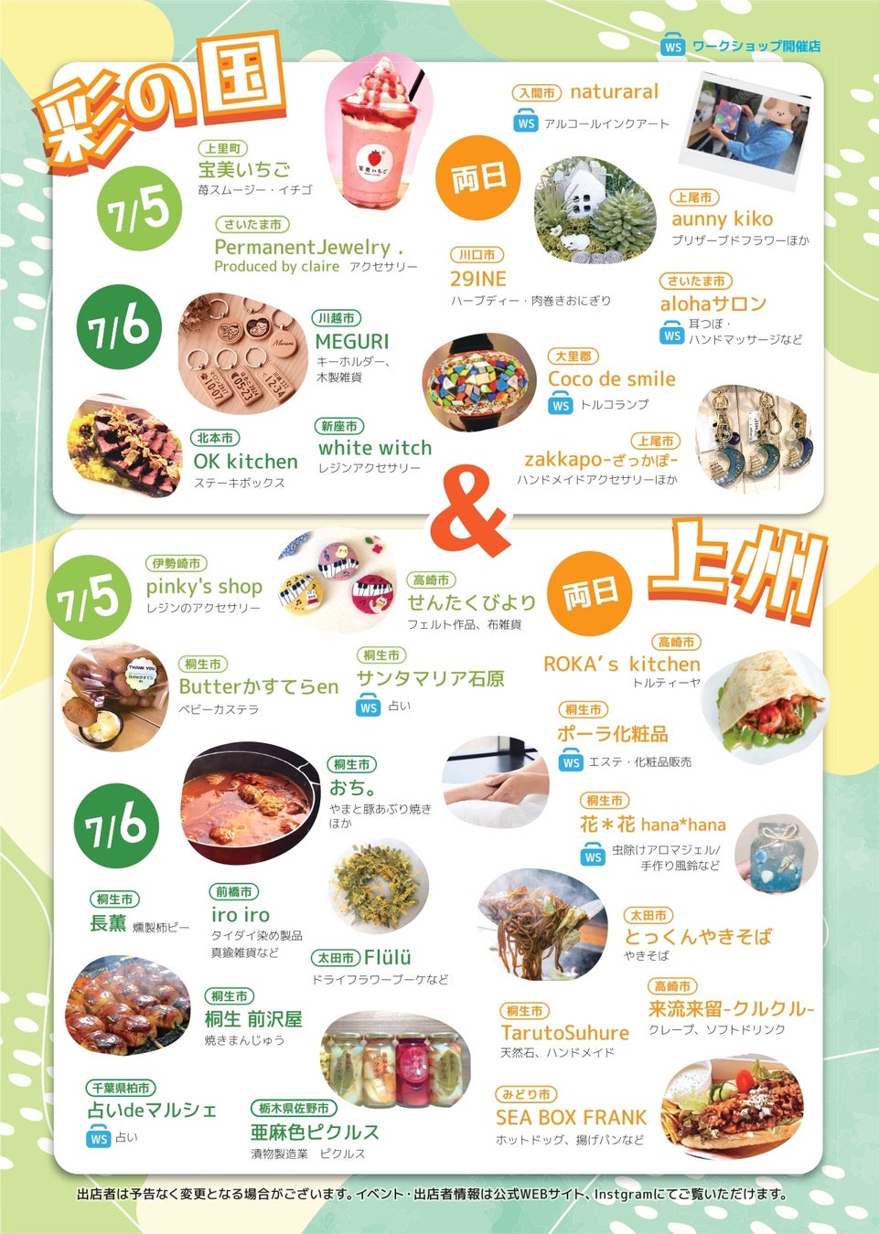 両日で32店舗出店します。(キッチンカー5台、フード7店舗、クラフト12店舗、ワークショップ8店舗)