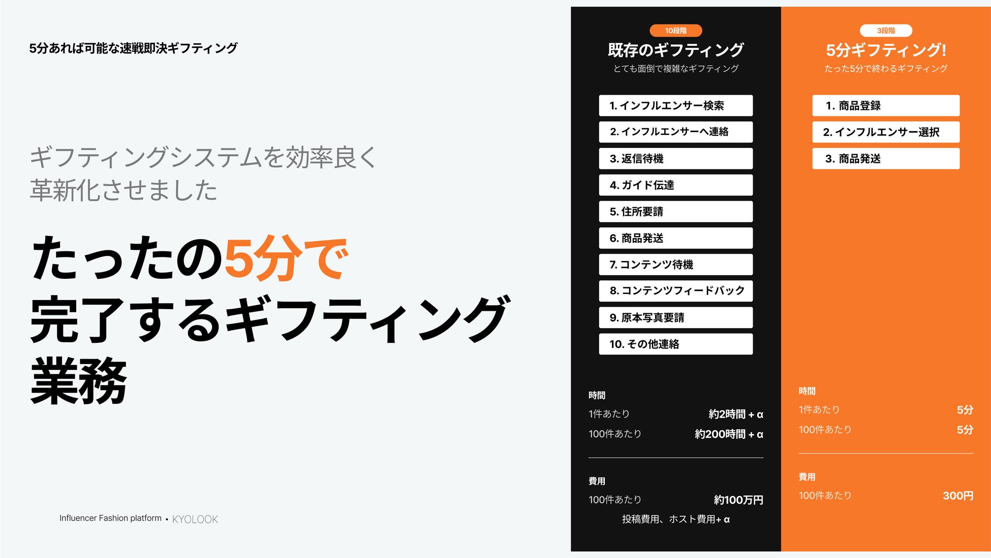 それをKYOLOOKなら「商品登録・インフルエンサー選定・商品発送の3点のみ・5分以内」に完結することができます。