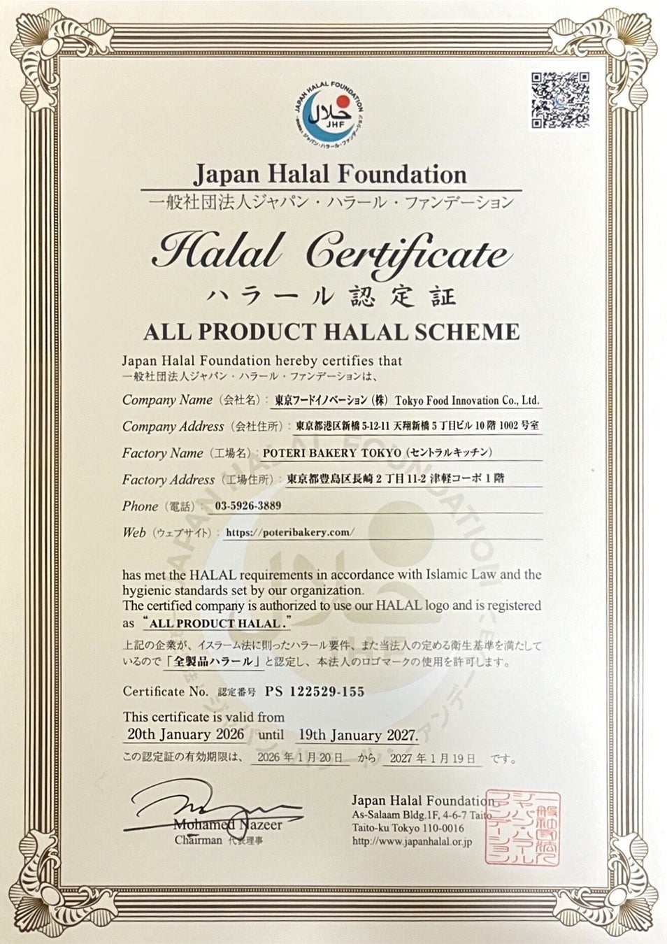 東京フードイノベーション株式会社(本社:東京都港区新橋5-12-11 天翔新橋5丁目ビル10階1002号室)が運営するカスタード生ドーナツ専門店「POTERI BAKERY -TOKYO-(ポテリベーカリートウキョウ)」は、2026年1月20日付で一般社団法人ジャパン・ハラール・ファンデーションより、ハラール認証(オールプロダクト・ハラール認証/全商品ハラール対応)を取得いたしました。