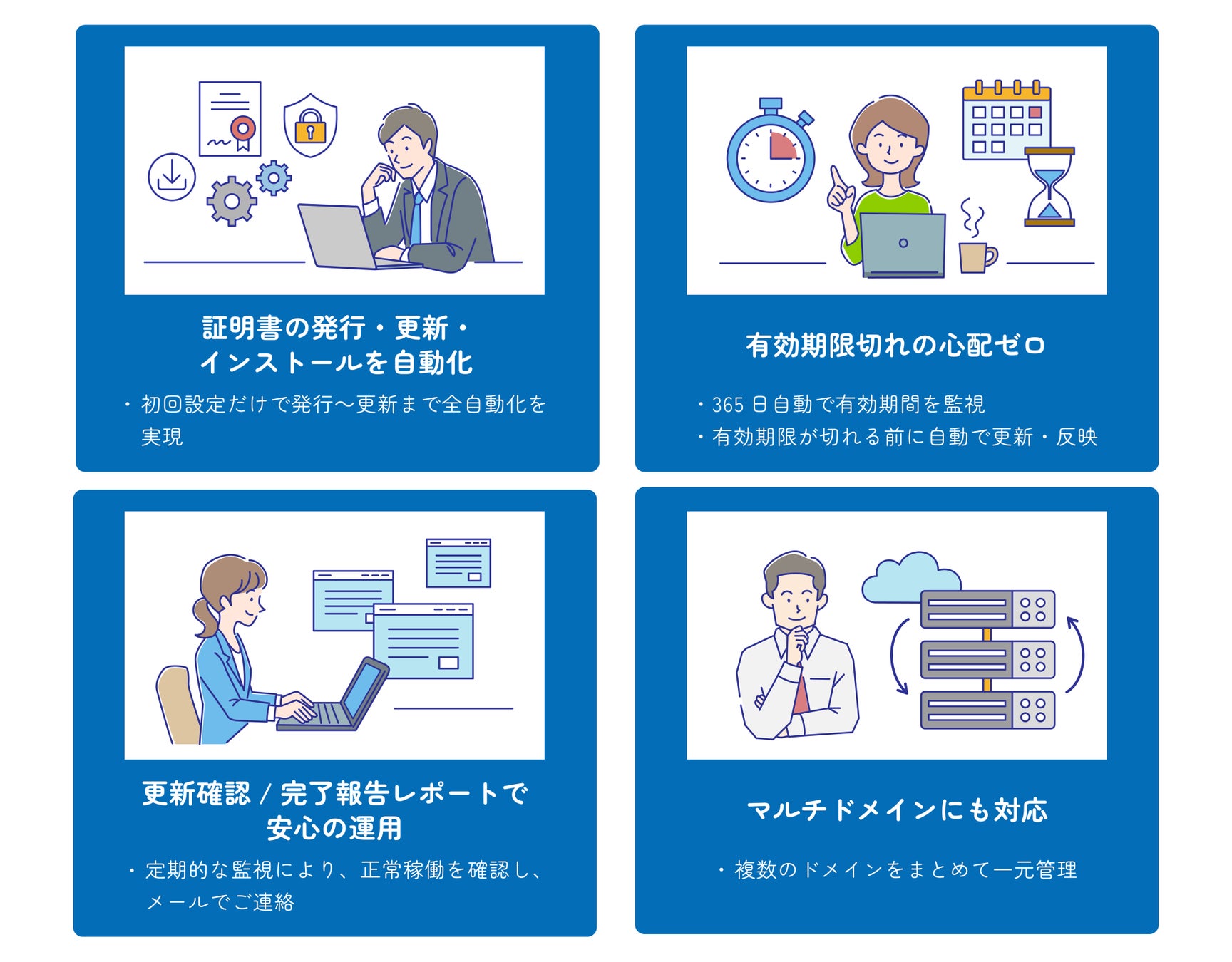 こうした課題を受け、当社は証明書更新業務のプロセスを自動化することで、企業の安全かつ安定したWeb運用を支援します。