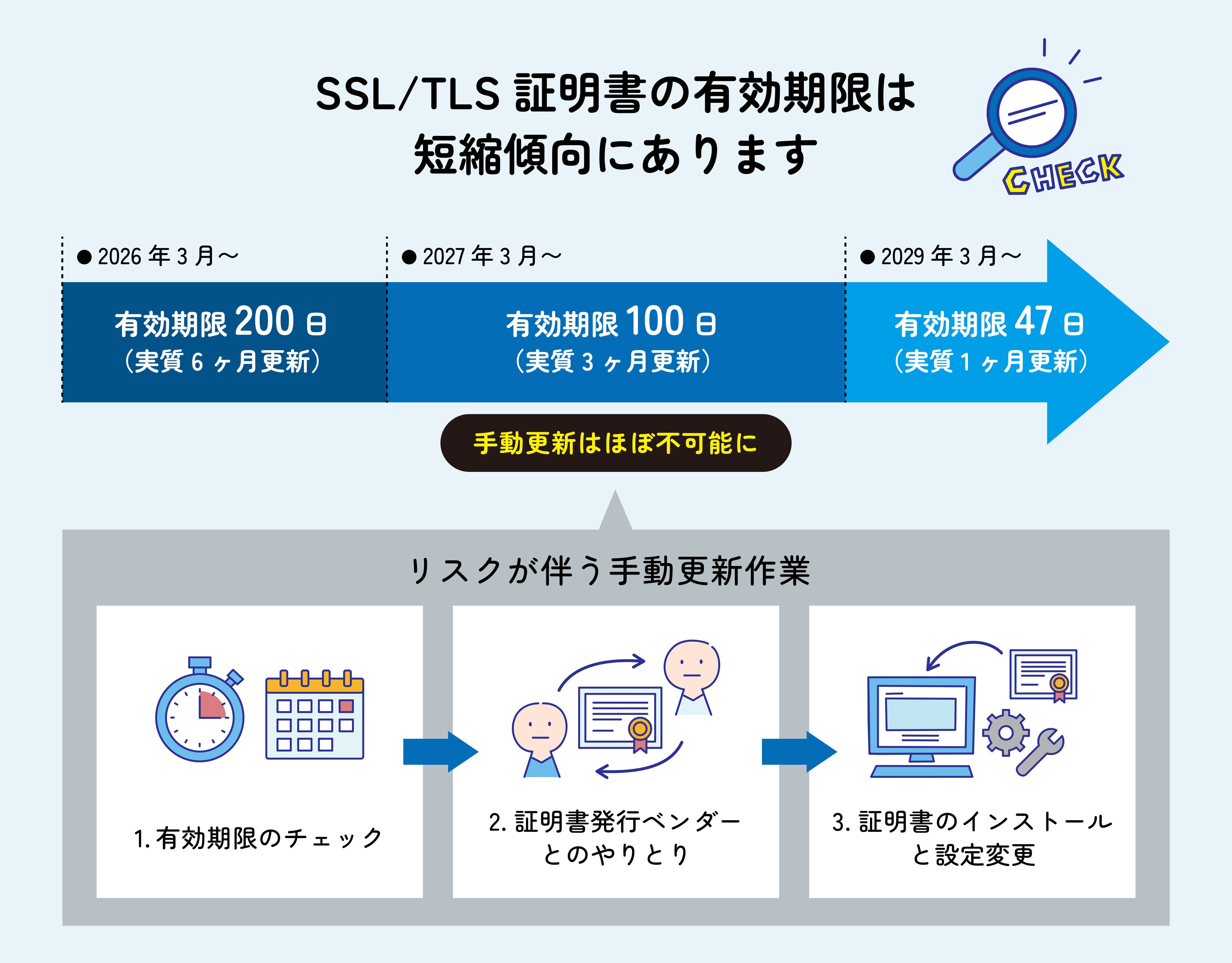 一方、証明書の有効期限が短縮されることにより更新頻度が増加し、運用担当者の負担や人的ミスのリスクが高まっています。さらに、証明書発行・更新作業には専門知識が必要となるため、担当者の育成や作業コストも運用の大きな負担となっています。