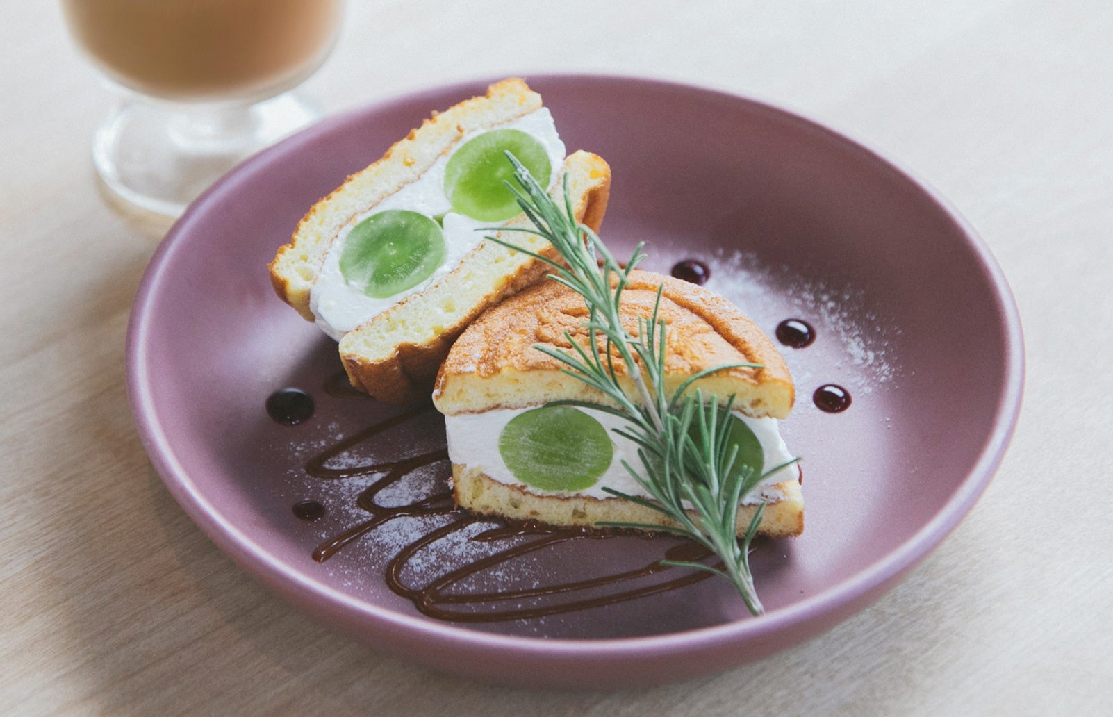 岡山・美作の番茶など、地元食材を活かしたメニューを揃えました。そしてなにより、ここでしか味わえない特別なワッフル生地のサンドイッチをお楽しみいただけます。