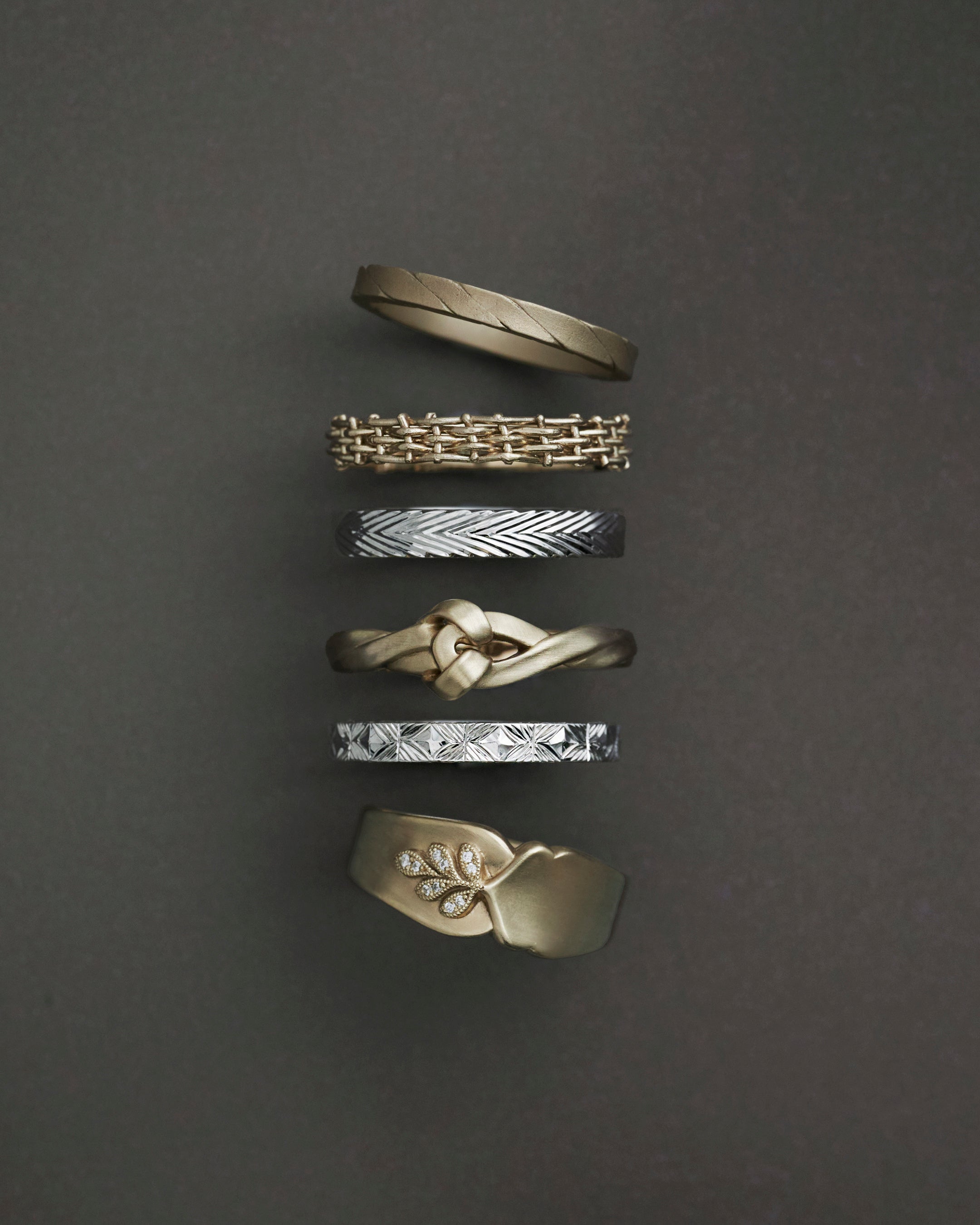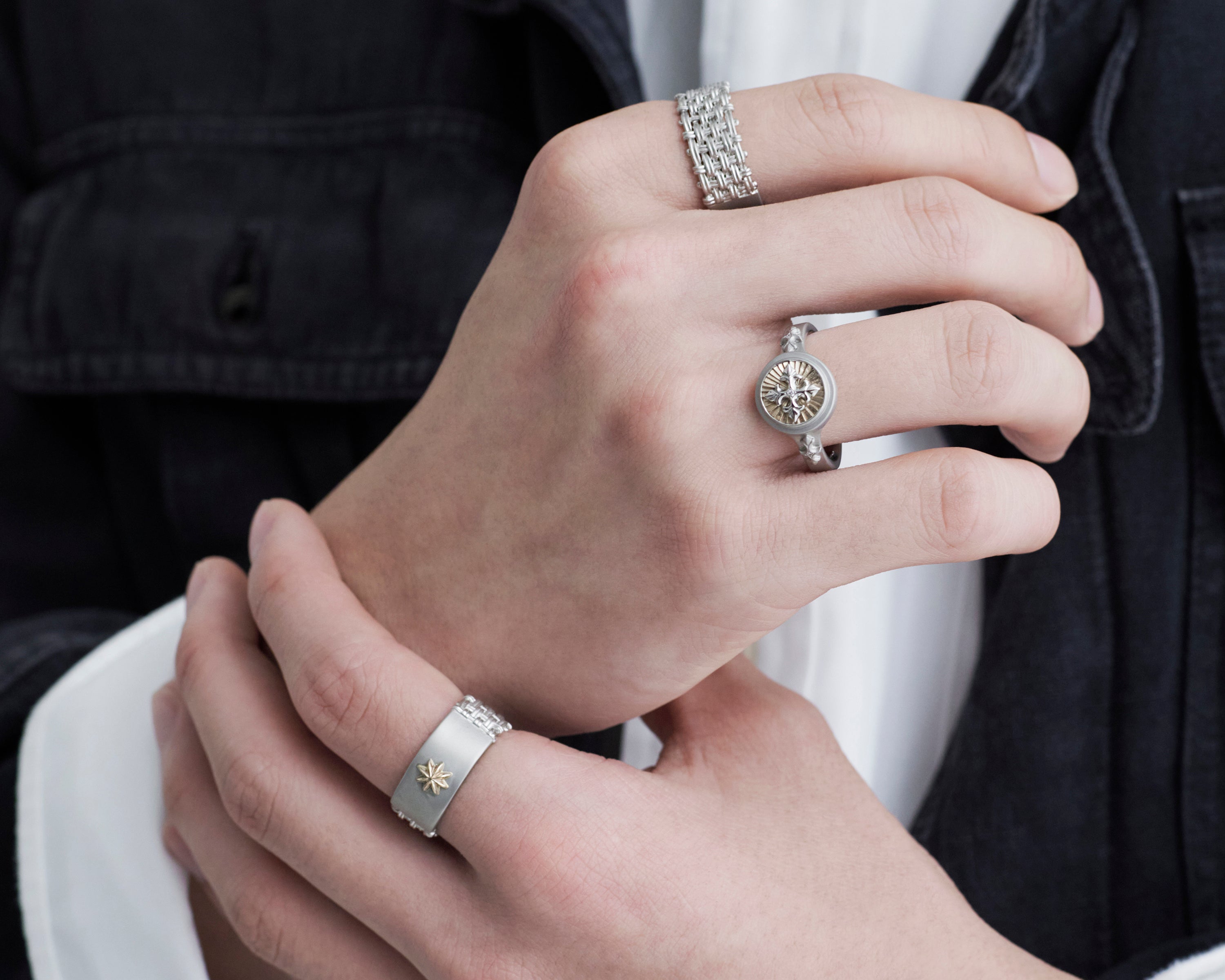 鎖帷子をイメージし、繊細な線を実際にひと目ずつ丁寧に編み込んで仕上げたリングは、反対側に星が一粒輝くマットなデザインで、表裏異なるダブルフェイス仕様です。