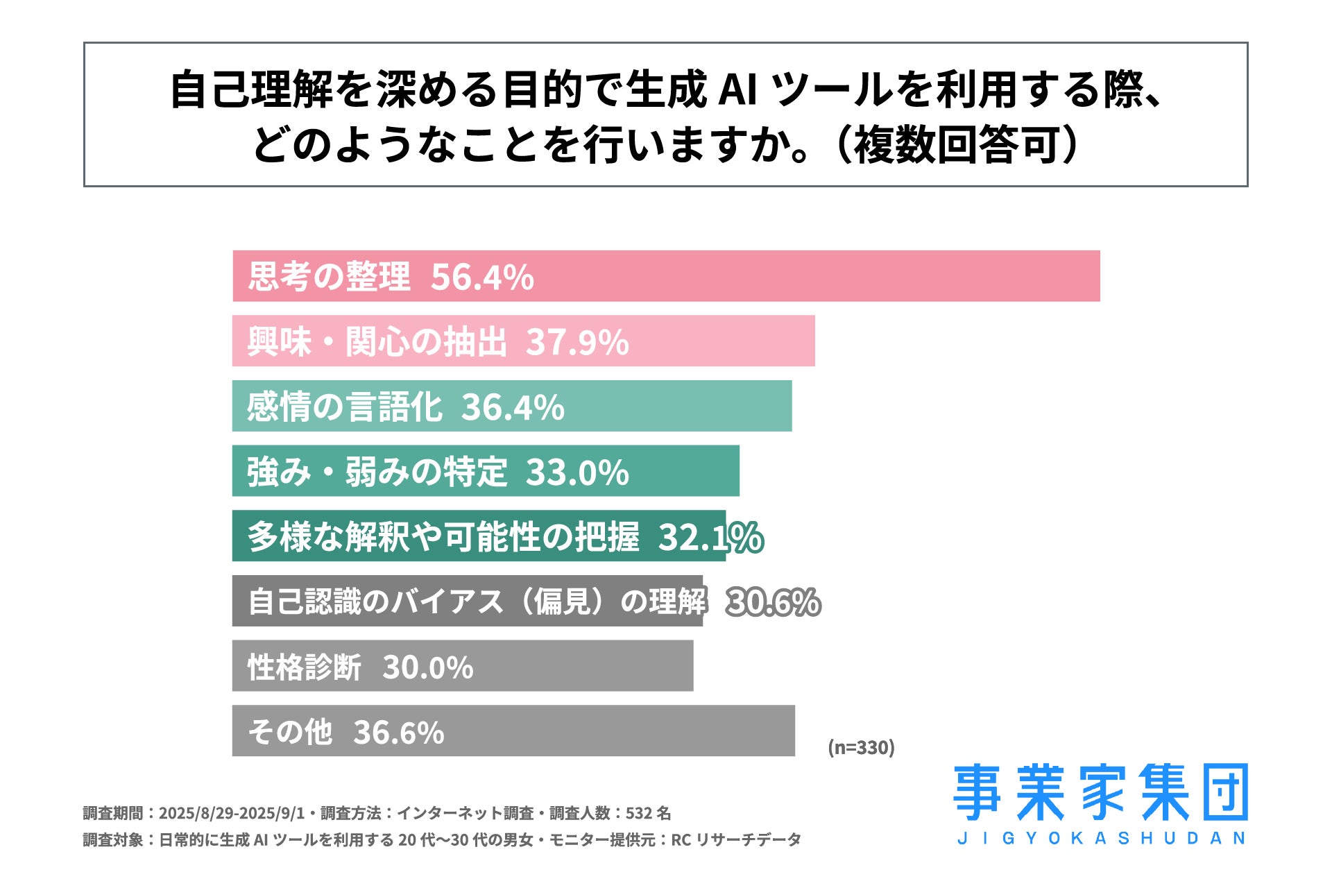 自己理解を深める目的で生成AIツールを利用する際、最も多くの人が、「思考の整理」を行っている