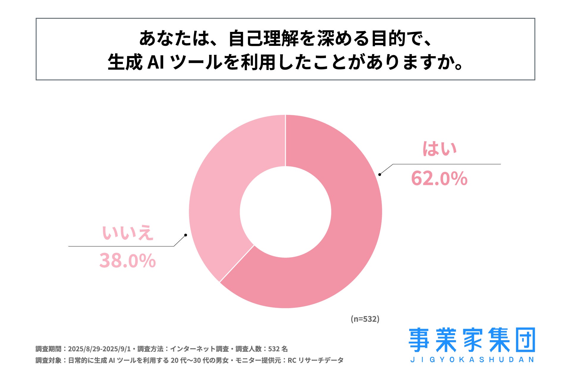 日常的に生成AIツールを利用する20代〜30代の男女の6割以上が、自己理解を深める目的で、生成AIツールを利用した経験がある