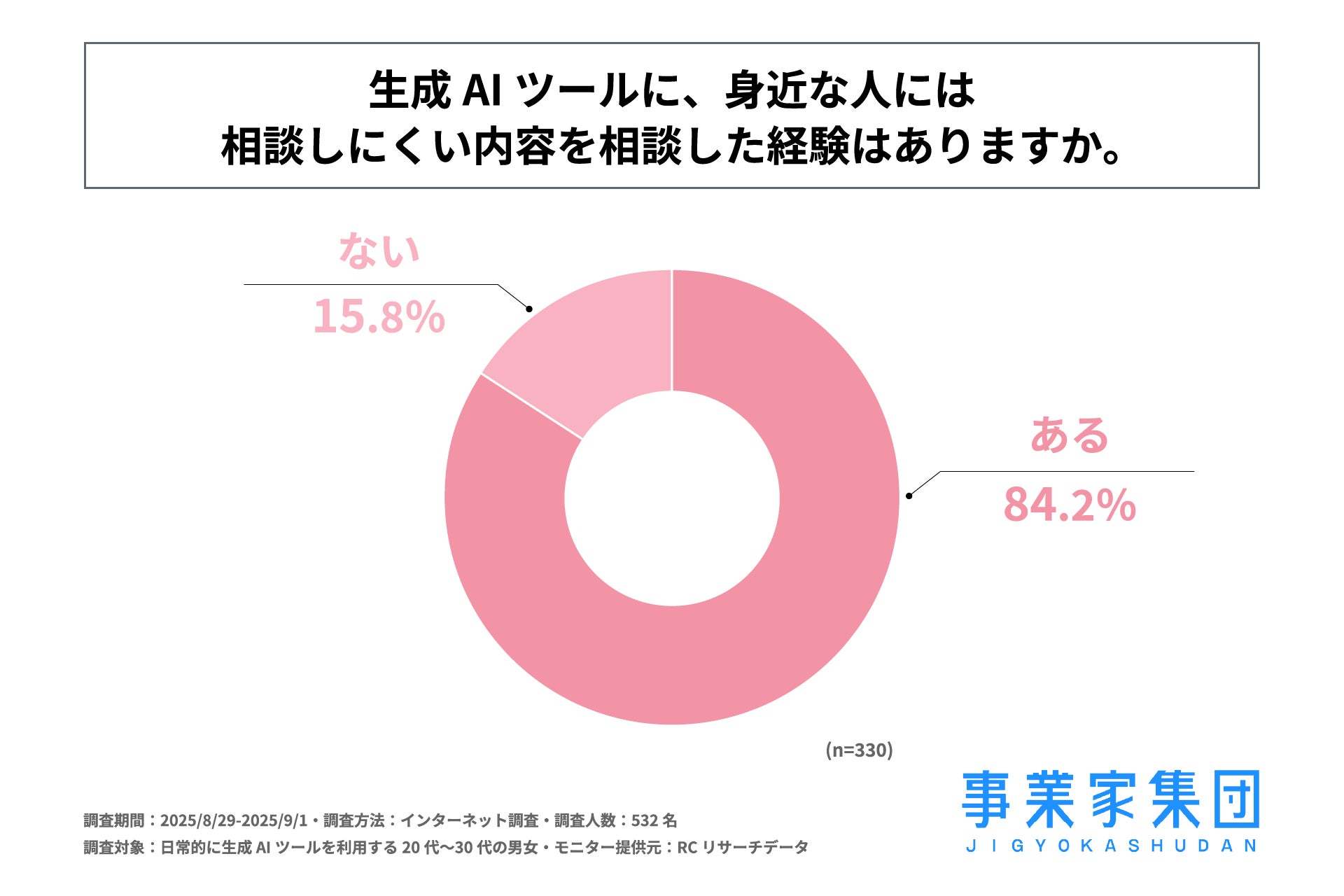 また、自己理解を深める目的で生成AIツールを利用したことがあると回答した人を対象に「生成AIツールに、身近な人には相談しにくい内容を相談した経験はあるか」を尋ねる設問への回答では、「ある」が84.2%、「ない」が15.8%という結果になりました。この結果から、自己理解を深める目的で生成AIツールを利用した人の8割強が、生成AIツールに、身近な人には相談しにくい内容を相談した経験があることが明らかになりました。