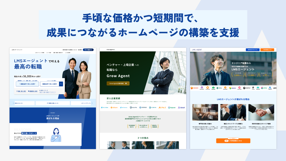 エージェントダッシュは、独立して間もない人材エージェントが求める「信用づくり」と「早期の事業立ち上げ」を支援し、手頃な価格かつ短期間で、成果につながるホームページの構築を支援します。