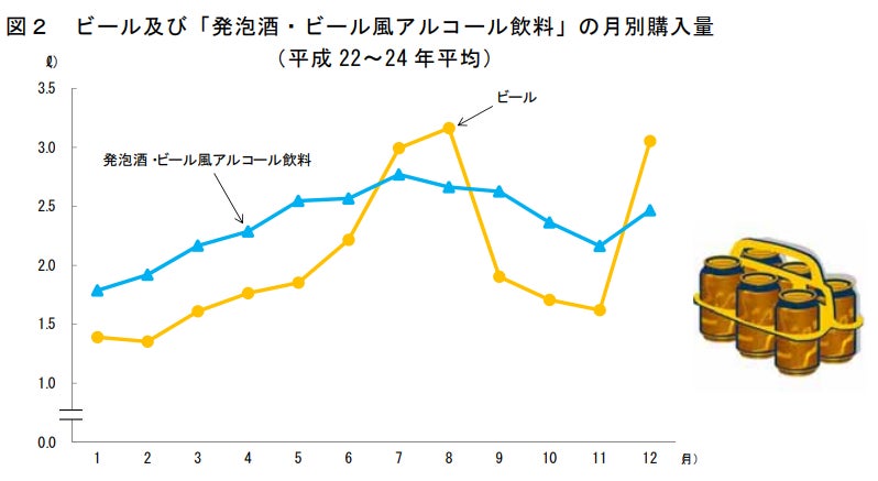 また、総務省統計局※2の調査によると、ビール及び発泡酒・ビール風アルコール飲料の購入量は、夏場に向けて増加し、特にビールは7月・8月の購入量が多くなっています。