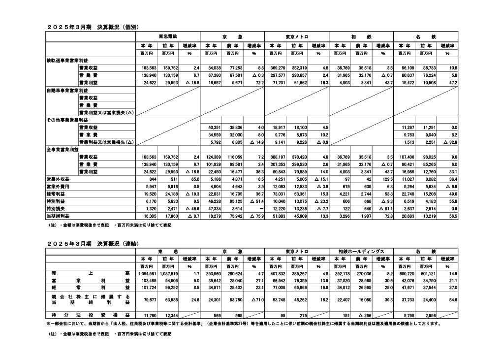 大手民鉄16社 2025年3月期 決算概況および鉄軌道事業旅客輸送実績
