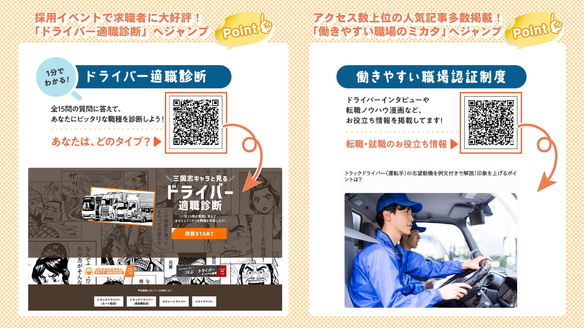 その他にもドライバー職への関心を高める工夫として、自分がどのドライバー職に向いているか診断することができるドライバー適職診断や、ドライバー職への転職・就職に役立つ情報ページへ誘導するQRコードを掲載し、求人への応募という行動へ結びつくよう後押しをしています。