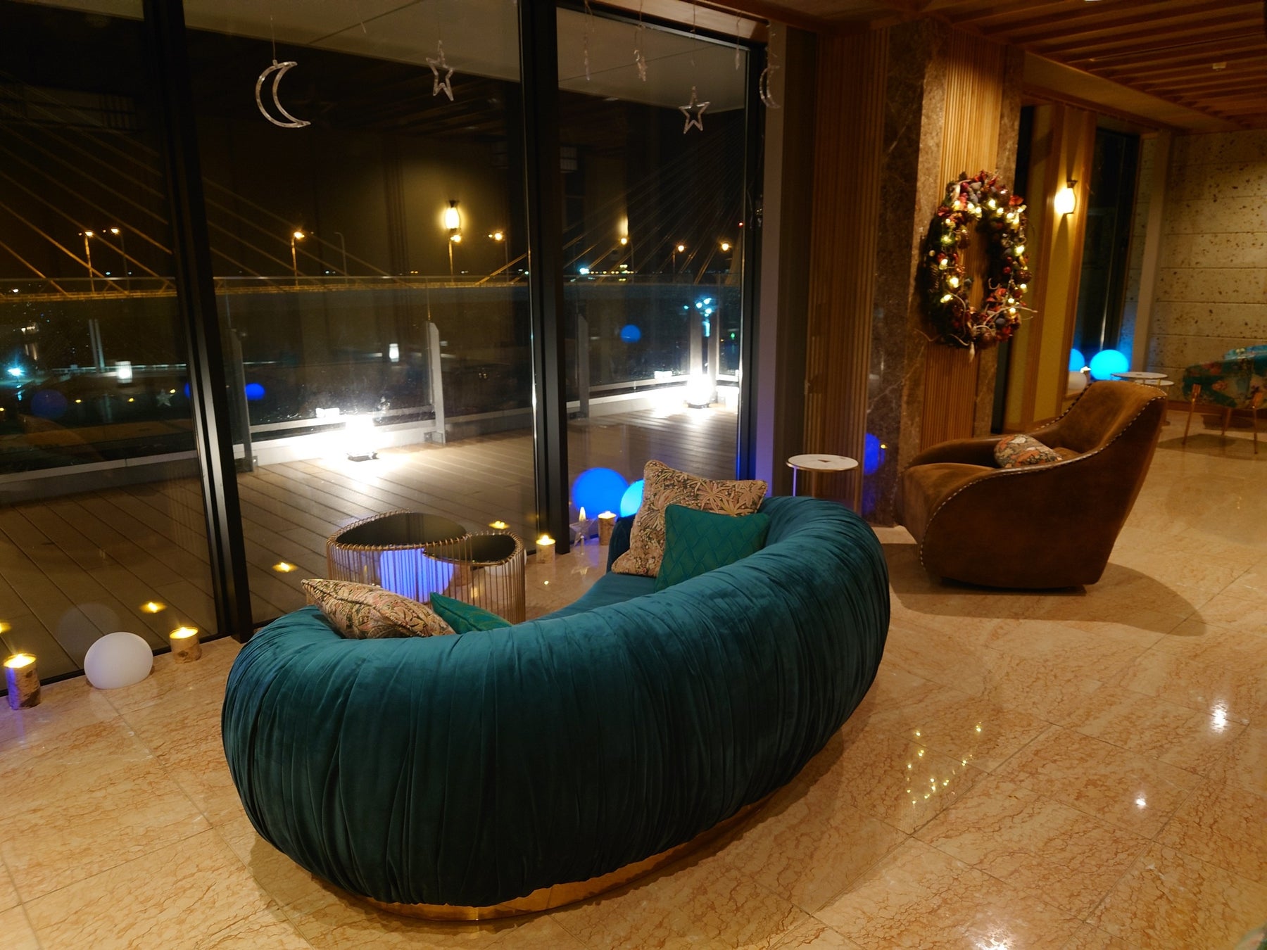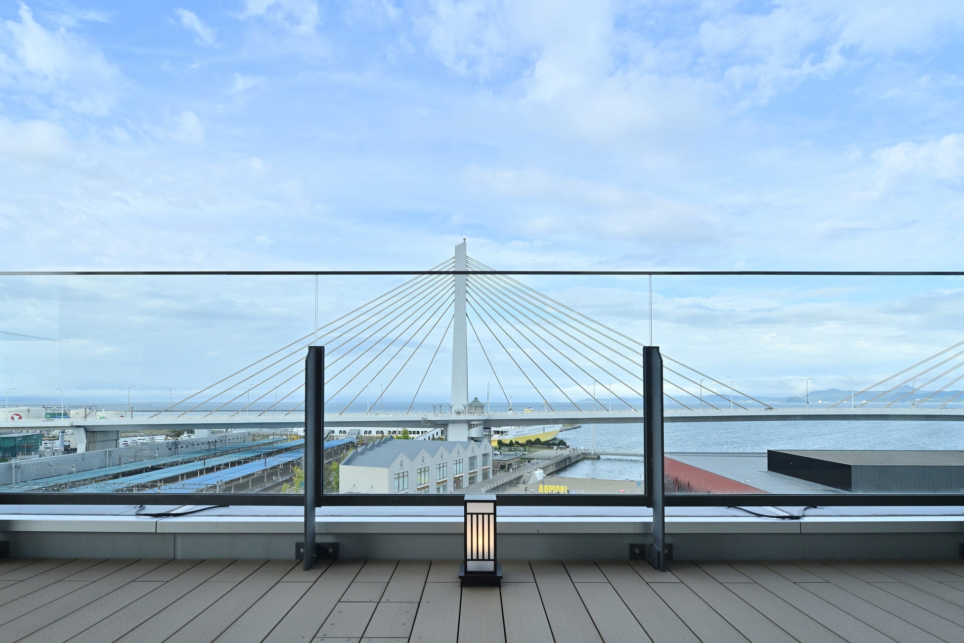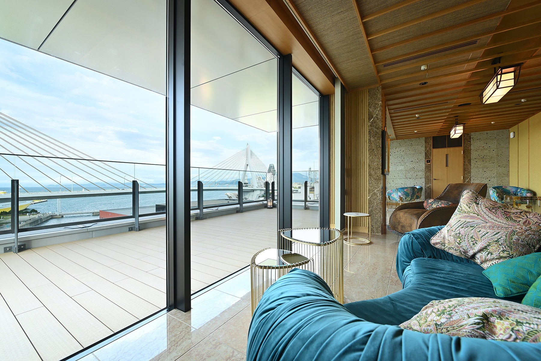 津軽海峡を一望できるウッドデッキを備えた和の設計匠松葉啓が設計デザインと家具の選定をラウンジで優雅なひと時をお楽しみいただけます。