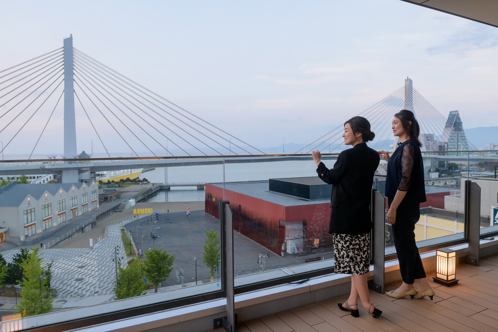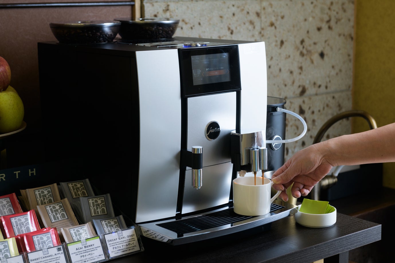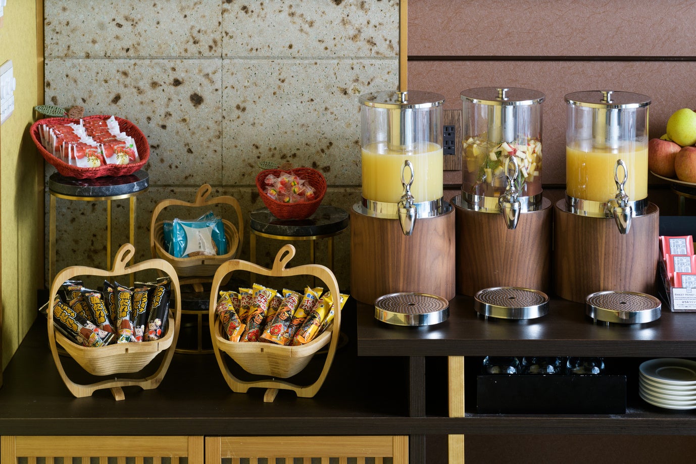 チェックインした後にコーヒーやウエルネスドリンク、りんごや季節の果実などをお楽しみいただけますし、入浴後に絶景を眺めながら寛ぐこともできます。