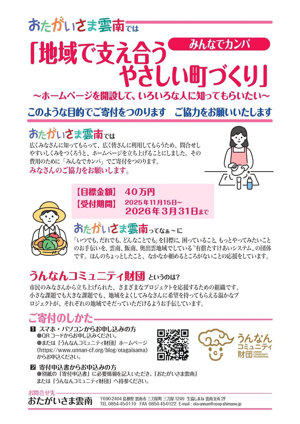 公益財団法人うんなんコミュニティ財団(島根県雲南市、代表:郷原 剛志)が行う地域密着型クラウドファンディング事業を活用し、おたがいさま雲南(任意団体、島根県雲南市三刀屋町三刀屋1249、代表:田中学)は、支え合いの関係性をひろげる地域社会の実現を目指し、クラウドファンディングによる資金調達を開始します。このプロジェクトは、2026年3月31日までの期間限定で、目標金額は40万円です。