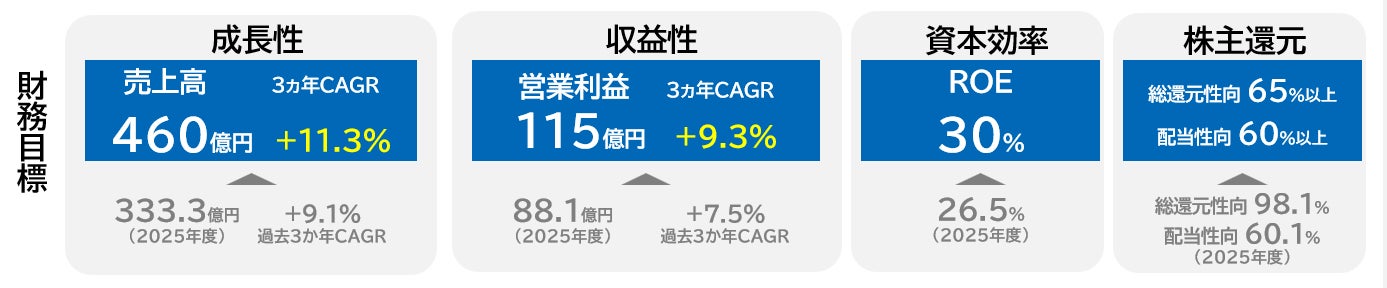 新中期経営計画では、前計画(2023-2025)の成長スピードをさらに加速させ、持続的な企業価値向上を図ります。2028年度の財務目標として、売上高460億円(3か年平均成長率11.3%)、営業利益115億円(同9.3%)を設定いたしました。また、資本効率の追求によりROE30%、株主還元として総還元性向65%以上(累進配当の継続)を目標とし、投資家および全てのステークホルダーの皆様の期待に応える成長イメージを描いております。