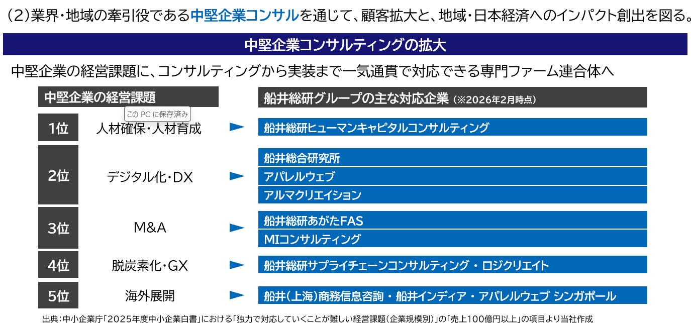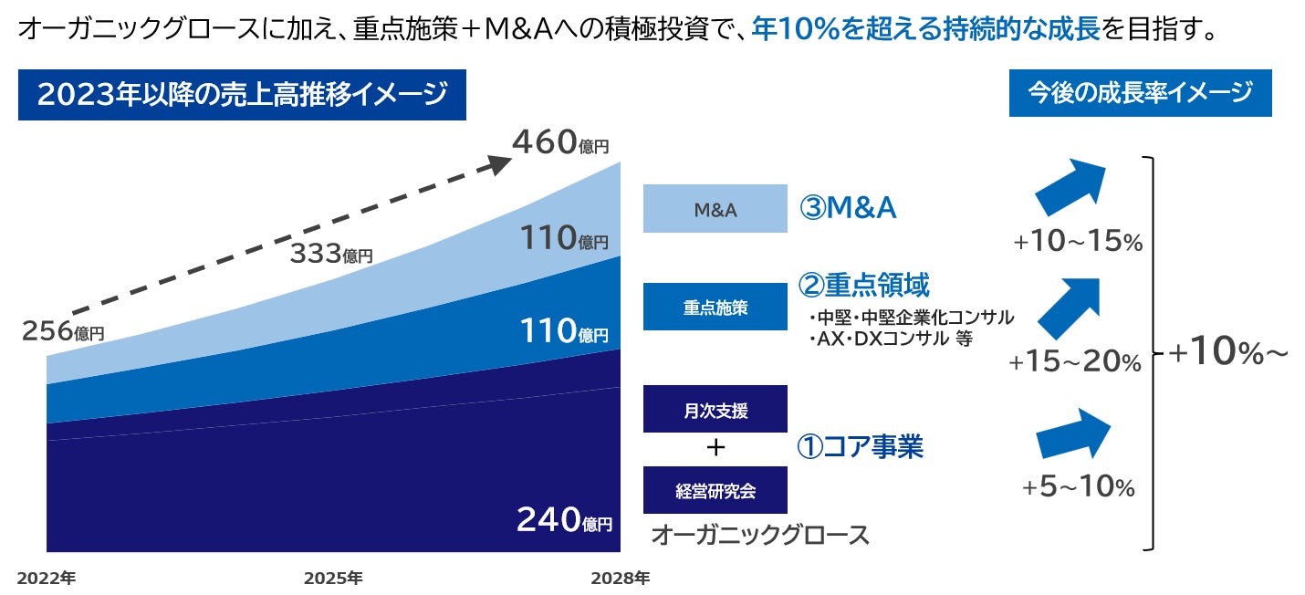 目標達成に向けた具体的な戦略として、(1)中堅企業向けテーマ別経営研究会の拡大、(2)100億企業化🄬・人的資本経営・生成AI・DX・M&A・サプライチェーンコンサルティングの拡充、(3)地方銀行連携等による顧客裾野の拡大を推進します。特に、中堅企業「化」を志向する企業が直面する「独力で解決困難な課題」に対し、グループ各社の専門機能をコンサルティングから実行支援までワンストップで提供できる体制を構築いたしました。また、積極的なM&Aにより、コンサルティングのケイパビリティを飛躍的に高めてまいります。