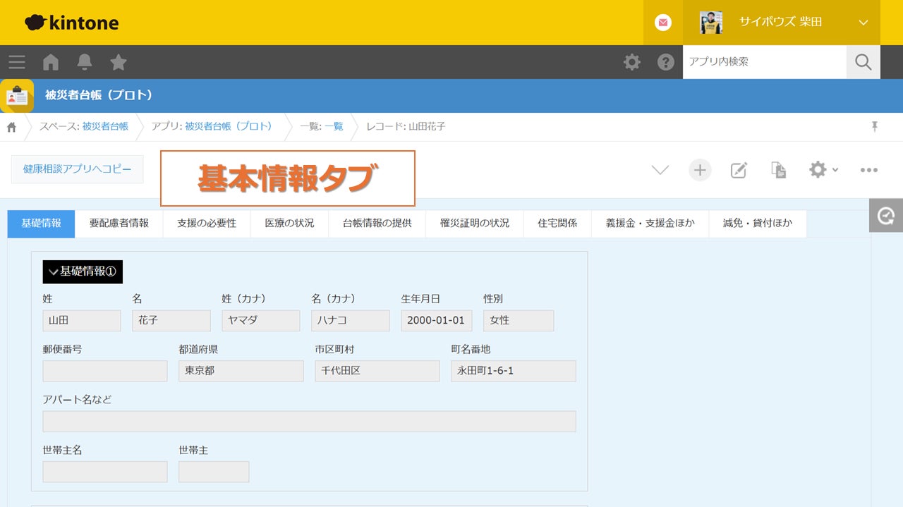 さらに、内閣府が発行した「被災者台帳の作成等に関する簡単手引き」を踏まえ、発災直後から生活再建までの支援情報を一元管理する「被災者台帳システム」をkintoneで整備します。これは各自治体が災害時に住民の被災情報を一元化し、迅速に支援するためのシステムです。
