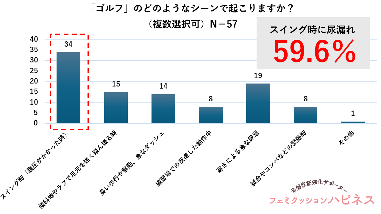 92名のアクティブな女子ゴルファーに対して、『ゴルフのプレー中または練習中に「尿漏れ」や「頻尿」などの不安・トラブルを感じたことがありますか?(単一回答)』と質問したところ、「よくある」「たまにある」「あまりないが不安はある」と回答した人が計62.0%(57人)となりました。さらに『具体的に「ゴルフ」のどのようなシーンで起こりますか?(複数選択可/尿トラブル経験者57人対象)』と質問したところ、「スイング時(腹圧がかかった時)」と答えた人が59.6%(34人)で最多で、次いで「寒さによる急な尿意」33.3%(19人)、「傾斜地やラフで足元を強く踏ん張る時」26.3%(15人)などが挙がりました。