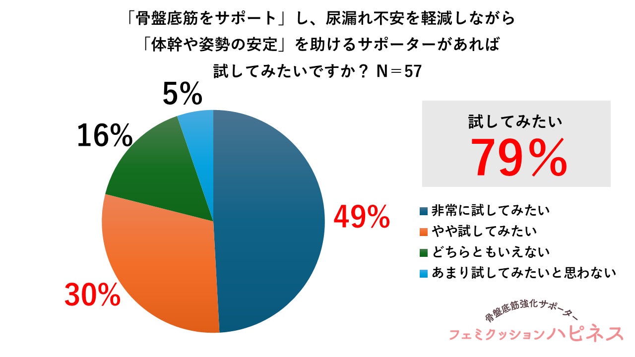 また尿漏れに不安を感じている57名に対して『「骨盤底筋をサポート」し、尿漏れの不安を軽減しながら「体感や姿勢の安定」を助けるショーツがあれば試してみたいか?(単一回答)』と質問したところ、「非常に試してみたい」「やや試してみたい」と回答したのが79%と約8割にも上り、フェミクッションハピネスへの期待の高さが伺えます。