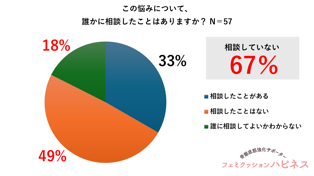 続いて『この悩みについて、誰かに相談したことはありますか?(単一回答)』と質問したところ、「相談したことがない」49.1%(28人)、「誰に相談してよいかわからない」17.5%(10人)と、合わせて約7割(66.6%)が“声を上げられていない”状態であることがわかりました。