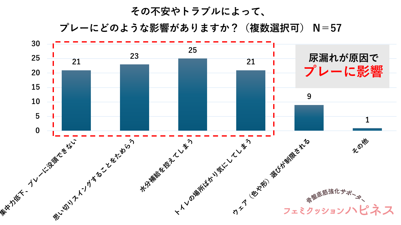 対象となった57名に対し、『その不安やトラブルによって、プレーにどのような影響がありますか?(複数選択可)』と質問したところ、「水分補給を控える」が43.9%(25人)で最多で、次いで「スイングをためらう」40.4%(23人)、「集中力が削がれる」36.8%(21人)、「トイレの場所を気にしてしまう」36.8%(21人)などが挙がりました。