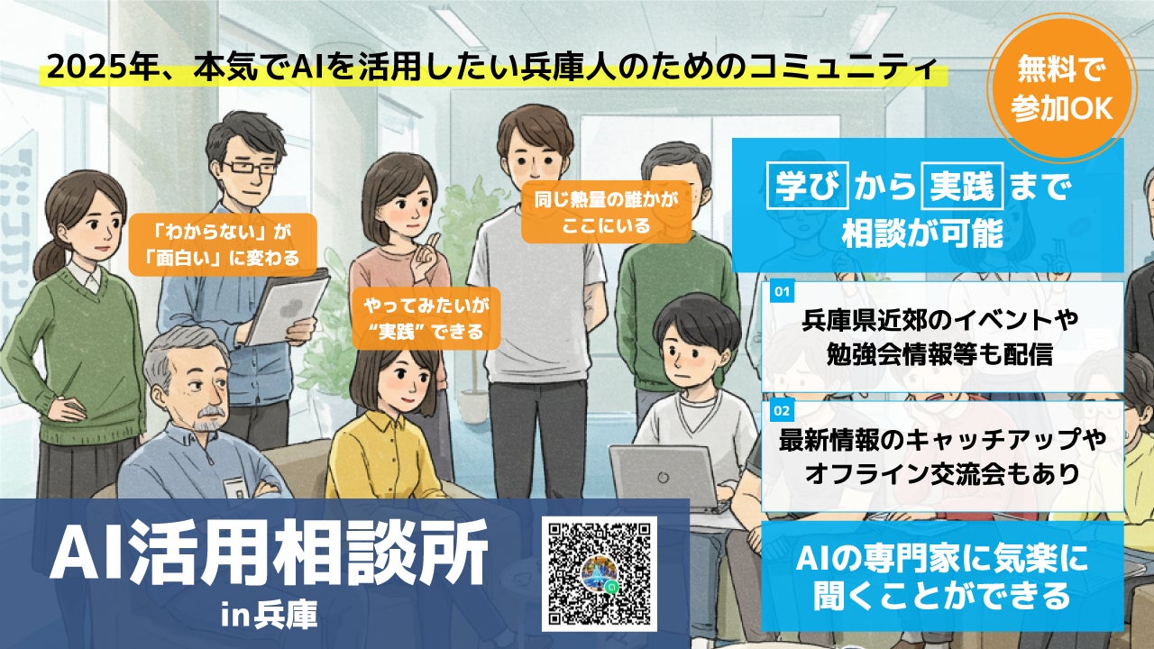 こうした現場支援の中で感じたのは、「AIを導入すること」ではなく、「使いこなす人を育てること」こそが地域の力になるということ。『AI活用相談所 in 兵庫』は、その想いをカタチにした、地域密着型の実践コミュニティです。