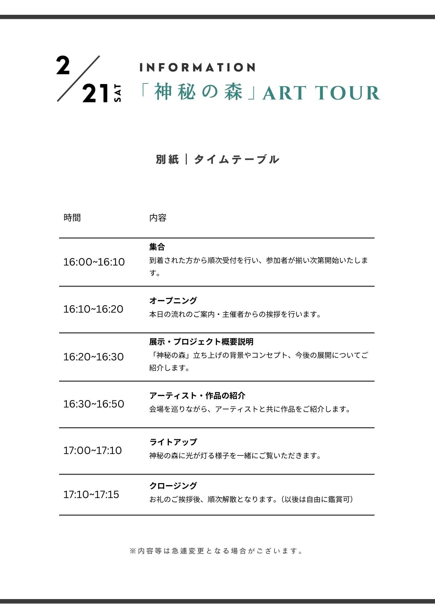 会期初日となる2月21日(土)には、クラウドファンディング支援者様8名を対象とした限定アートツアーを実施。アーティストやプロデューサー、ACTA+共同代表による解説とともに、作品の背景や素材のストーリーなど企画の裏側までを深く体感いただける特別プログラムとして開催します。夕方には展示会場の照明が一斉に灯るライトアップ鑑賞で昼とは違った森の様子をいち早くご体感いただけます。