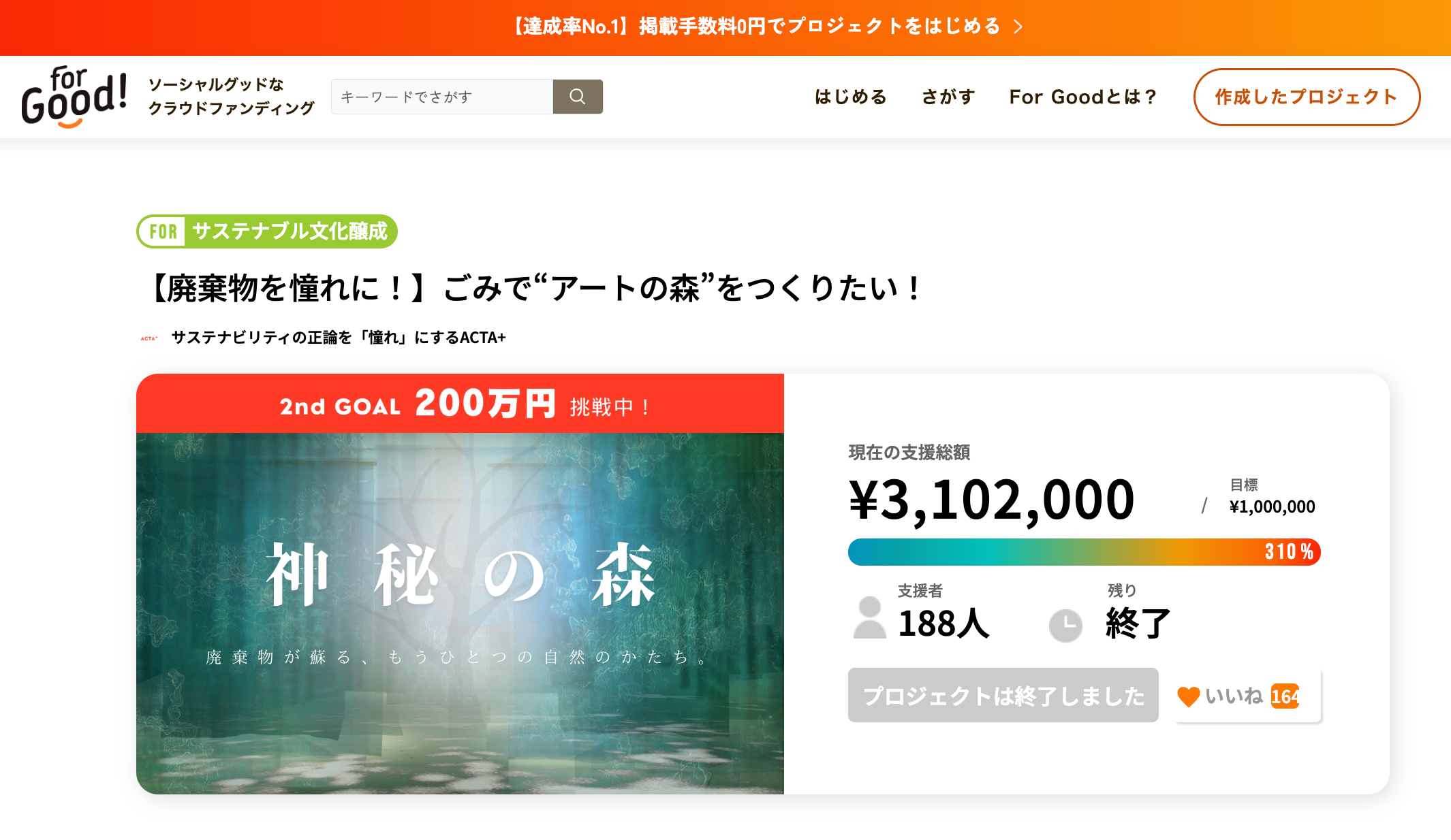 開催に先立ち実施したクラウドファンディングでは、目標金額の310%・200名近い方からの支援を達成しました(支援総額 3,102,000円/目標 1,000,000円)。これからの持続可能性のあり方を問い直す試みに、多くの共感と支援が集まりました。