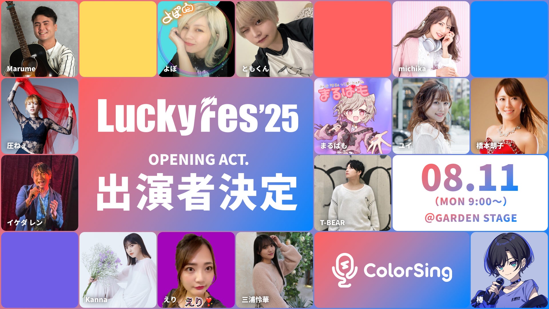 歌特化ライブ配信アプリ「ColorSing(カラーシング)」を運営するColorSing株式会社(東京都渋谷区、代表取締役社長 今井拓自、代表取締役会長 柴田順任 以下、当社)は、2025年8月9日(土)~8月11日(月・祝)に開催される音楽フェス「LuckyFes’25」のオープニングアクトとして出演するLシンガー(ColorSingでの配信者)14名が決定したことをお知らせいたします。