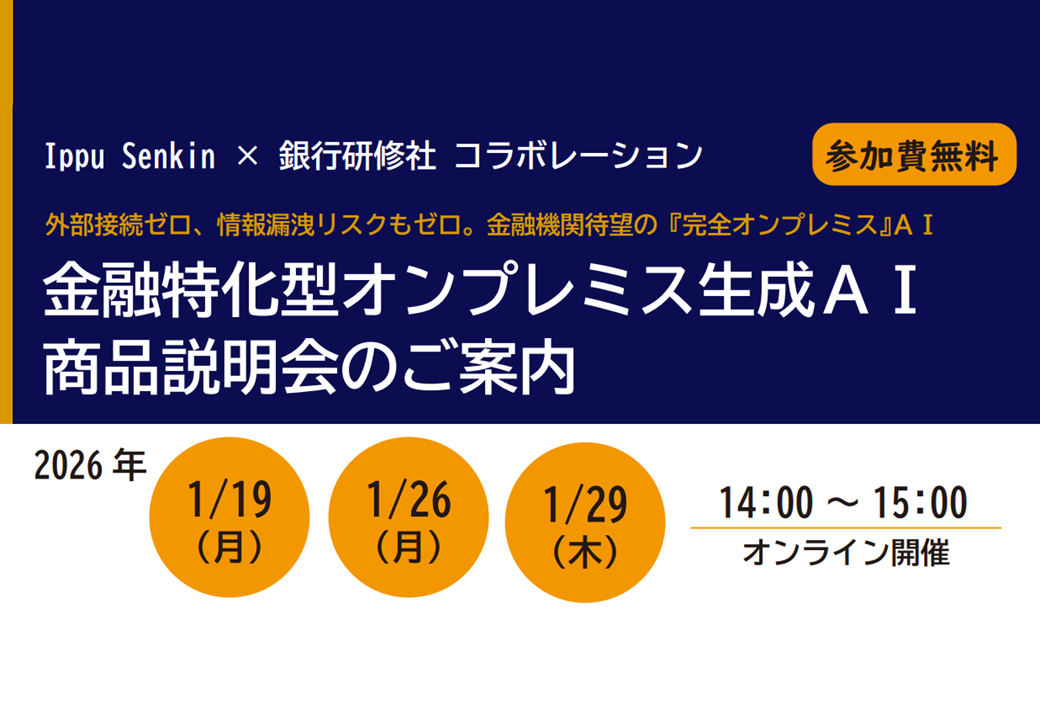 株式会社Ippu Senkin(本社:東京都中央区、代表取締役CEO:鈴木 秀弥、以下「Ippu Senkin」)は、株式会社銀行研修社(本社:東京都豊島区、代表取締役社長:星野 広友、以下「銀行研修社」)と共同で、金融機関向けオンプレミス生成AIの商品説明会を2026年1月にオンラインにて開催いたします。