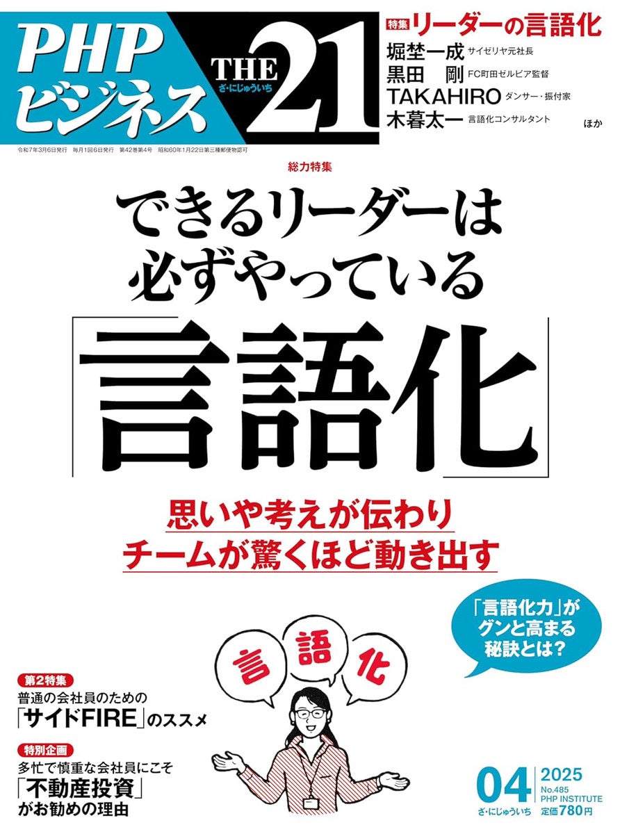 また、2025年4月号の「THE21」(PHP研究所)では、特集「できるリーダーは必ずやっている『言語化』」に木暮太一も登場。言語化の重要性が多方面で注目されている今、本研修を通じて実践的なスキルを学ぶ絶好の機会です。