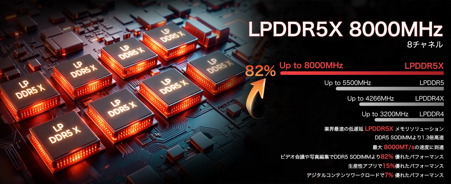 次世代のパフォーマンスを体現する「EVO-X2」には、LPDDR5X 8000MHzメモリを採用。しかも、MAX. 8000MHzという驚異的なクロック速度で駆動可能です。