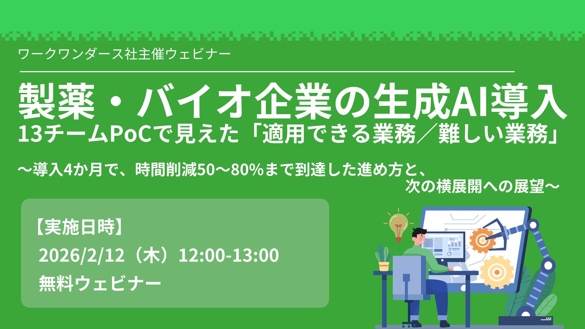 【2026年2月開催】製薬・バイオ業界の生成AI導入における「実利」を検証。13チームのPoCで最大50〜80%の時間削減を達成した「効果測定の型」を公開するセミナーを開催