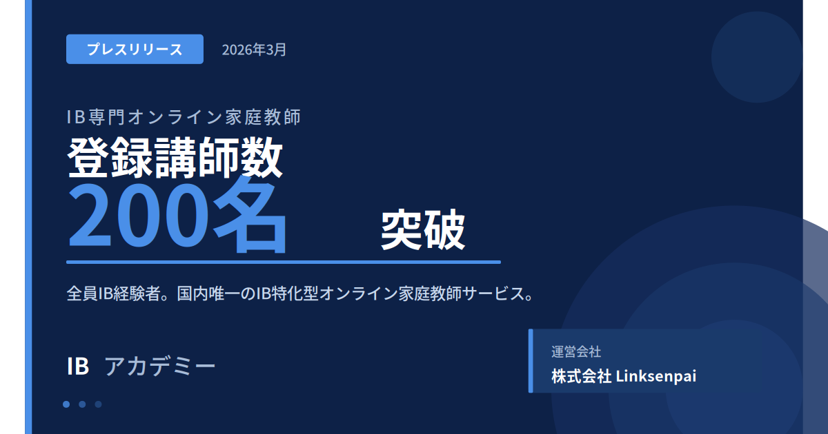 株式会社Linksenpai(所在地:東京都渋谷区、代表取締役:吉田志織)が運営するIB(国際バカロレア)専門 オンライン家庭教師サービス「IBアカデミー」は、2026年3月、登録講師数が200名を突破したことをお知ら せします。 日本国内のIB認定校・候補校数は2025年12月時点で260校(文部科学省IB教育推進コンソーシアム調べ)に 達し、IB生の数は年々増加しています。一方で、IBの高度な学習要求に応えられる専門家庭教師は慢性的に不 足しており、IBアカデミーはこの課題に応えるべく講師ネットワークの拡充を続けてきました。