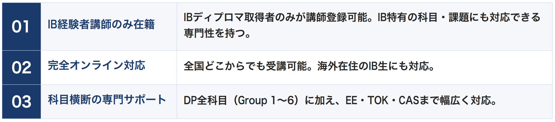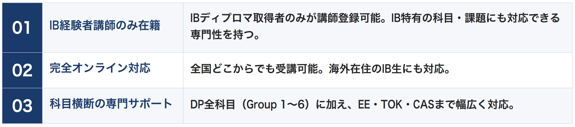 IBアカデミーは、IB(国際バカロレア)ディプロマを取得した経験者のみが講師として登録できるという厳格 な基準を設けています。IBのカリキュラムは一般的な学校教育と大きく異なり、課題論文(EE)・知の理論( TOK)・創造性・活動・奉仕(CAS)といった独自科目への対応には、実際にIBを経験した講師が不可欠です 。