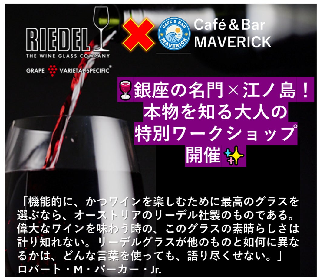 2025年6月28日(土)、神奈川県・江ノ島の「Cafe&Bar MAVERICK」にて、リーデルグラスを愛する本物志向の方向けに、五感で体験する特別なワインイベントが開催されます。