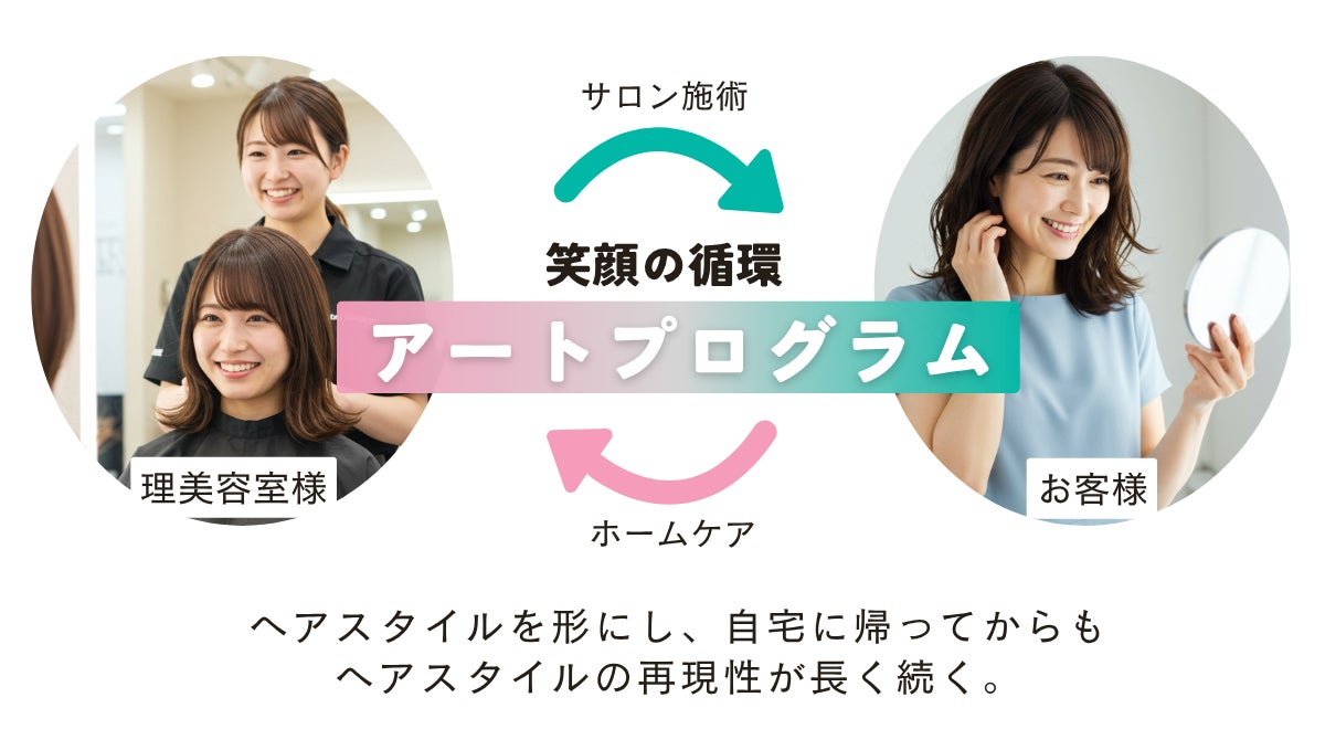 アートケアによって髪が整い、環境から受けるダメージからも守られる。お客様はこれまで諦めていた理想のデザインにもっと挑戦できるようになる。そのヘアスタイルを理美容師様が形にし、お客様が自宅に帰ってからも簡単に再現でき、仕上がりが長く続く。鏡の前で笑顔になる日が増え、そしてまた次の「なりたい理想」が生まれる。私たちは、この前向きな笑顔の循環を「アートプログラム」と呼んでいます。
