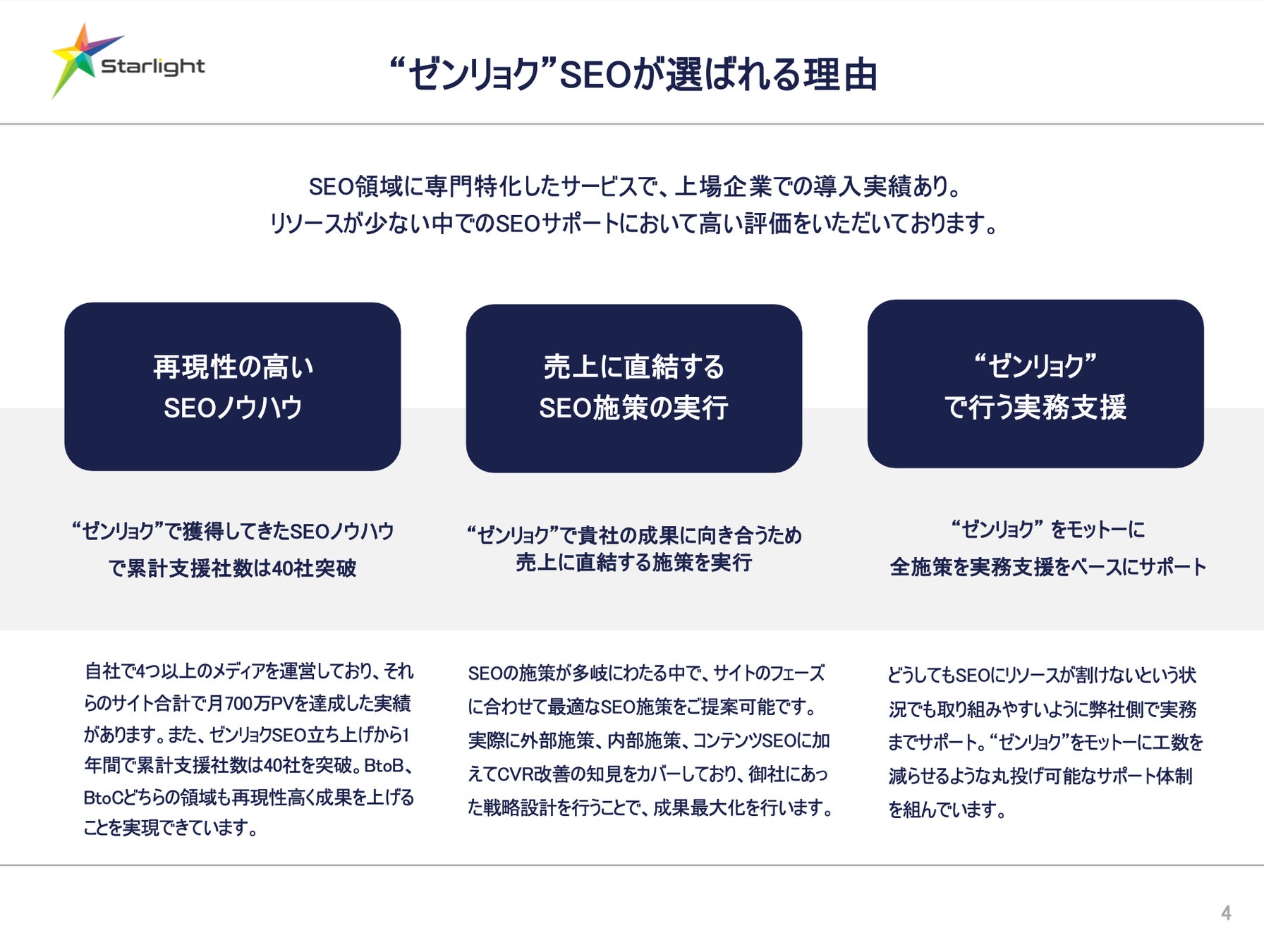 株式会社Starlight(本社:東京都豊島区、代表取締役社長:黒田 真乃介、以下「当社」)は、SEOの支援サービス「"ゼンリョク"SEO」の提供を開始しました。「"ゼンリョク"SEO」は、ただのSEOコンサルティングサービスではなく、実務までSEOを"丸投げ"できるサービスです。今まで60社以上で行ってきたSEOサービスをもとに、リソース不足の解消とアクセスの増加を両立して実現することが可能です。
