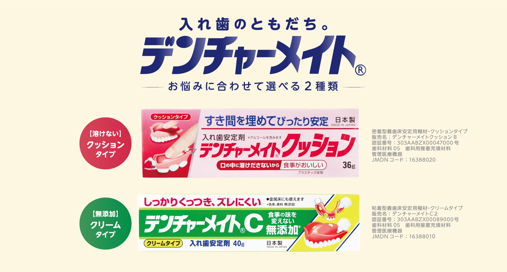 「デンチャーメイト」は、義歯(入れ歯)をしっかり安定させるための入れ歯安定剤のブランドです。食事や会話の際に義歯がズレにくくなることで、快適な日常生活をサポートします。クッションタイプの デンチャーメイトクッション、クリームタイプの デンチャーメイトCの2つのタイプがあります。