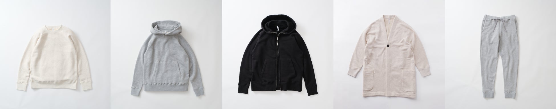 ▽左からプルオーバー、パーカー、ダブルジップパーカー、ロングカーディガン、ロングパンツ