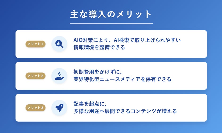 AIOプランでは、AIが参照しやすい第三者視点の記事を継続的に発信することで、企業名やサービス、技術領域がAI検索で取り上げられる機会を高めることができます。また、初期費用なしで業界特化型のニュースメディアを構築できるほか、制作した記事をSNS・動画・資料へ展開することで、広報・営業・採用など幅広い場面で活用しやすいコンテンツとして運用できます。
