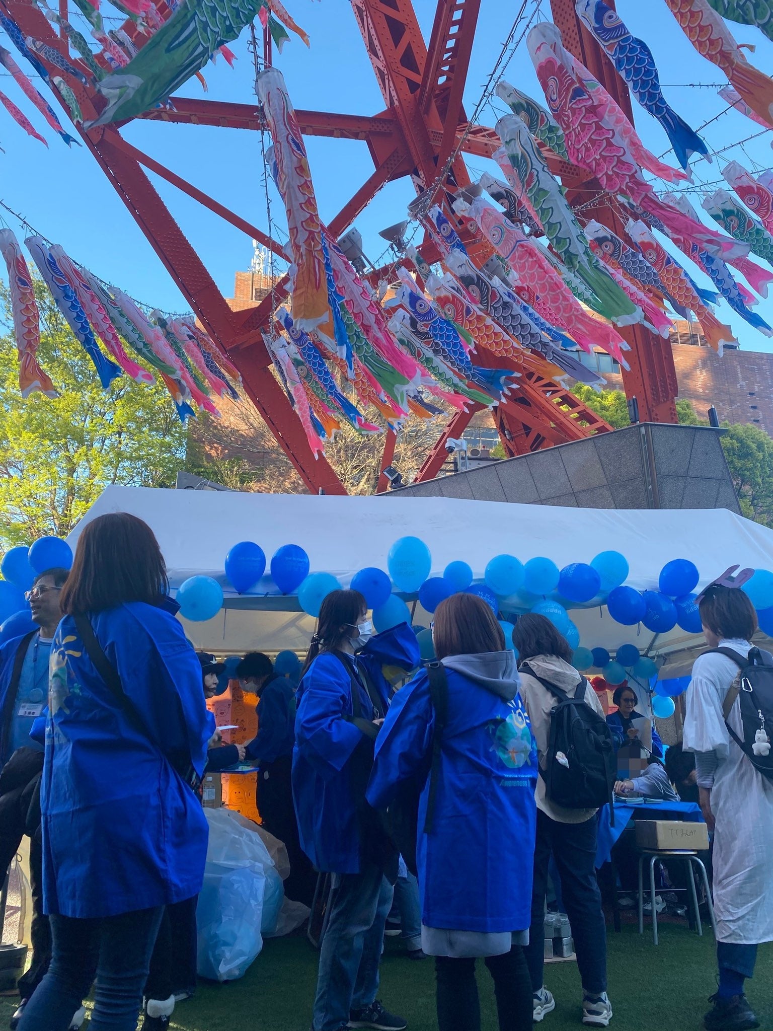18時からは、世界自閉症啓発デー日本実行委員会が主催する東京タワーライトアップ点灯式。「5・4・3・2・1、点灯」の掛け声とともに、東京タワーが青くライトアップされました。満開の桜、夜空にはためく鯉のぼり、満月が花を添えました。