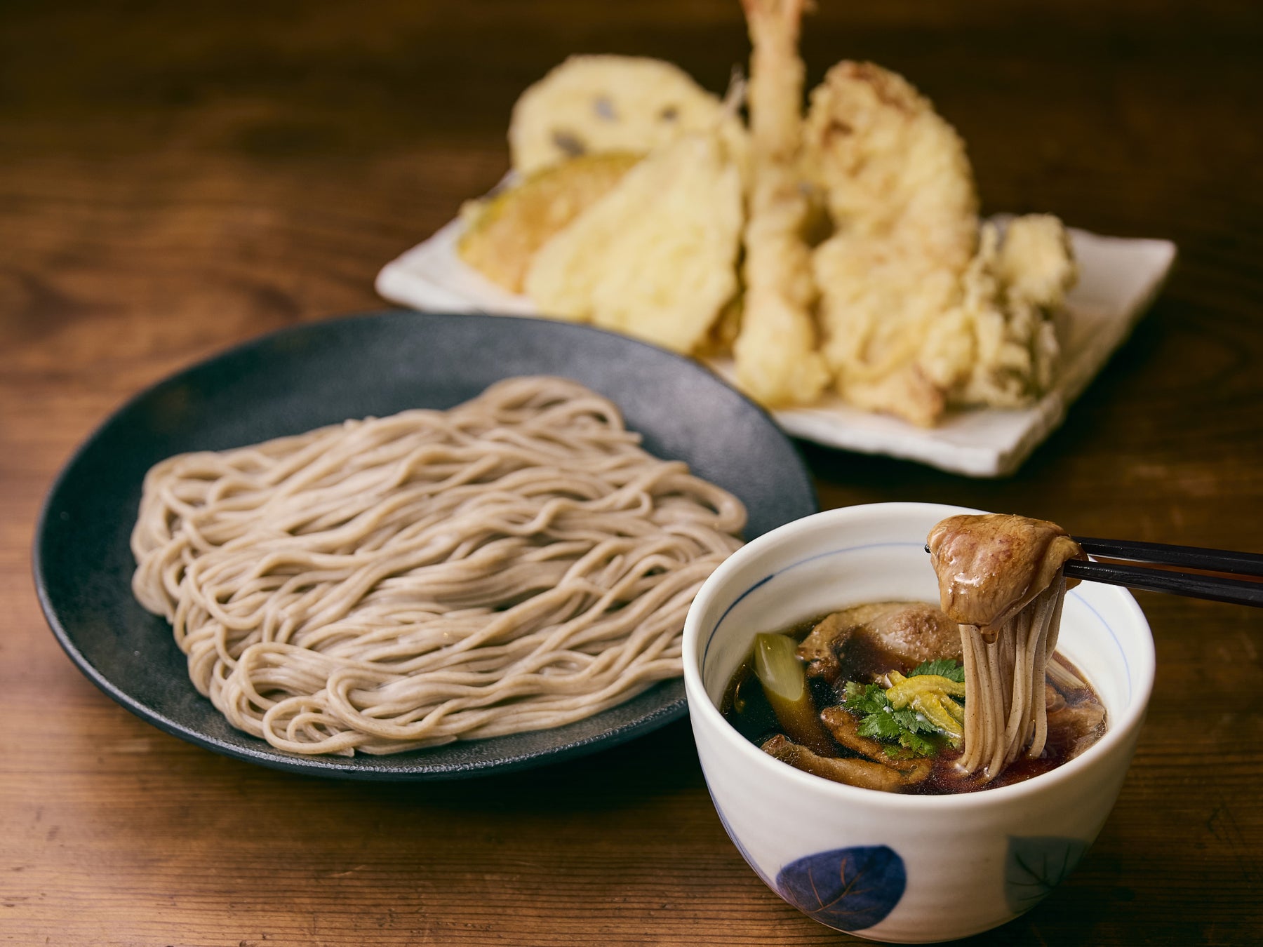 さらに、天ぷらと相性抜群の『まきの天盛り鴨つけ蕎麦』と『まきの天盛り鴨南蛮蕎麦』も登場します。肉厚でやわらかい鴨ロース肉のみを使用し、出汁とともにじっくり火を入れることで、脂の甘みが溶け出した特製出汁が完成しました。合鴨肉の旨みが染みわたる、冬にほっとする味わいです。どちらの蕎麦にも人気の天ぷら6品をセットにしており、香り高い蕎麦、そして揚げたてサクサクの天ぷらを合わせてお愉しみいただけます。