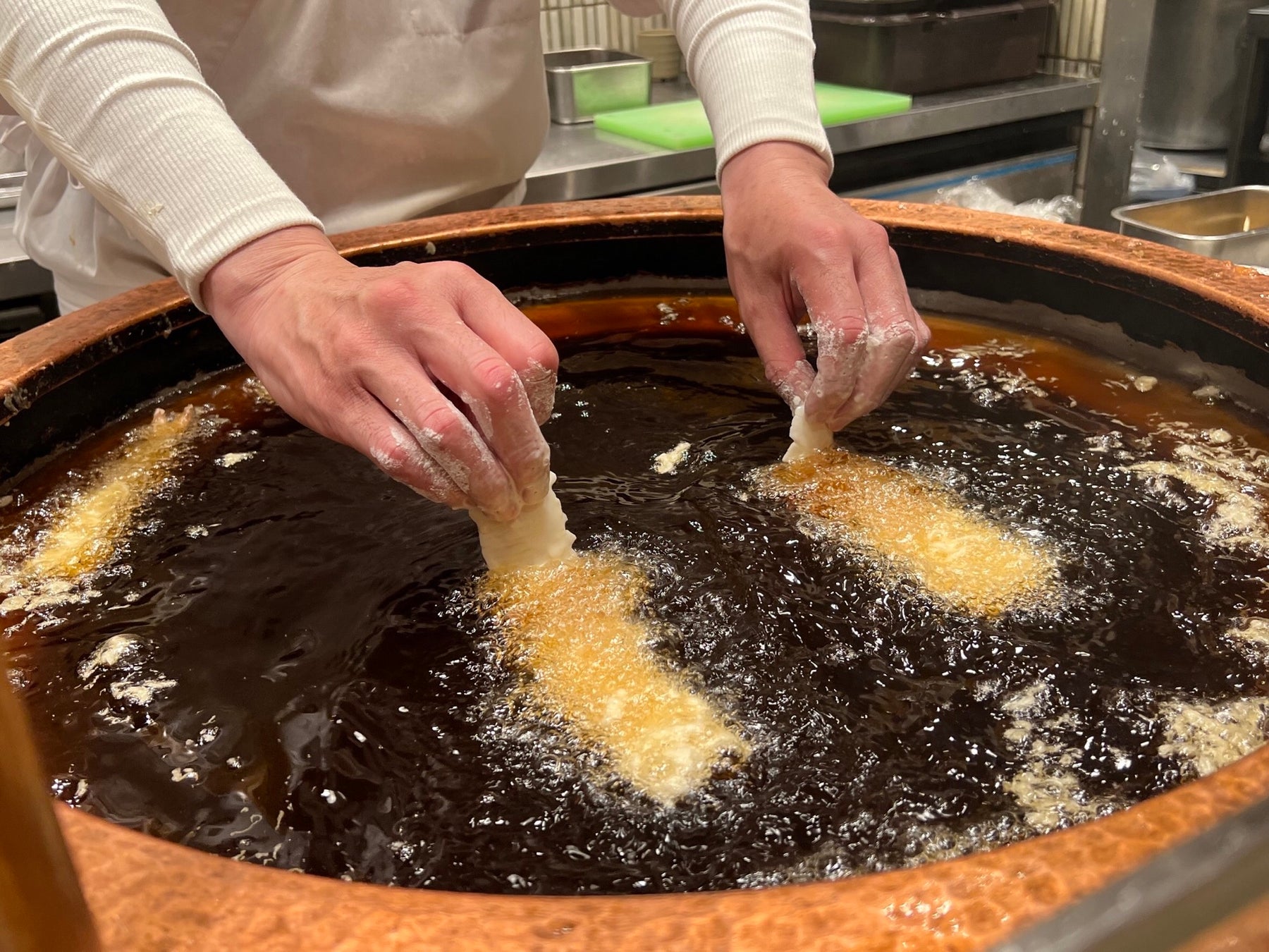 オリジナルブレンドの天粉を使い、白絞め油でカラッと揚げることで、食感と後味が軽やかなサクサクの衣に。衣の中で蒸しあげられることから“蒸し焼き料理”ともいわれる天ぷらですが、この蒸し上げる工程で食材の旨みをぎゅっと凝縮します。食材ごとに衣のまとわせ方や投入後の振り、揚げ時間にもこだわり、食材のおいしさを最大限引き出します。