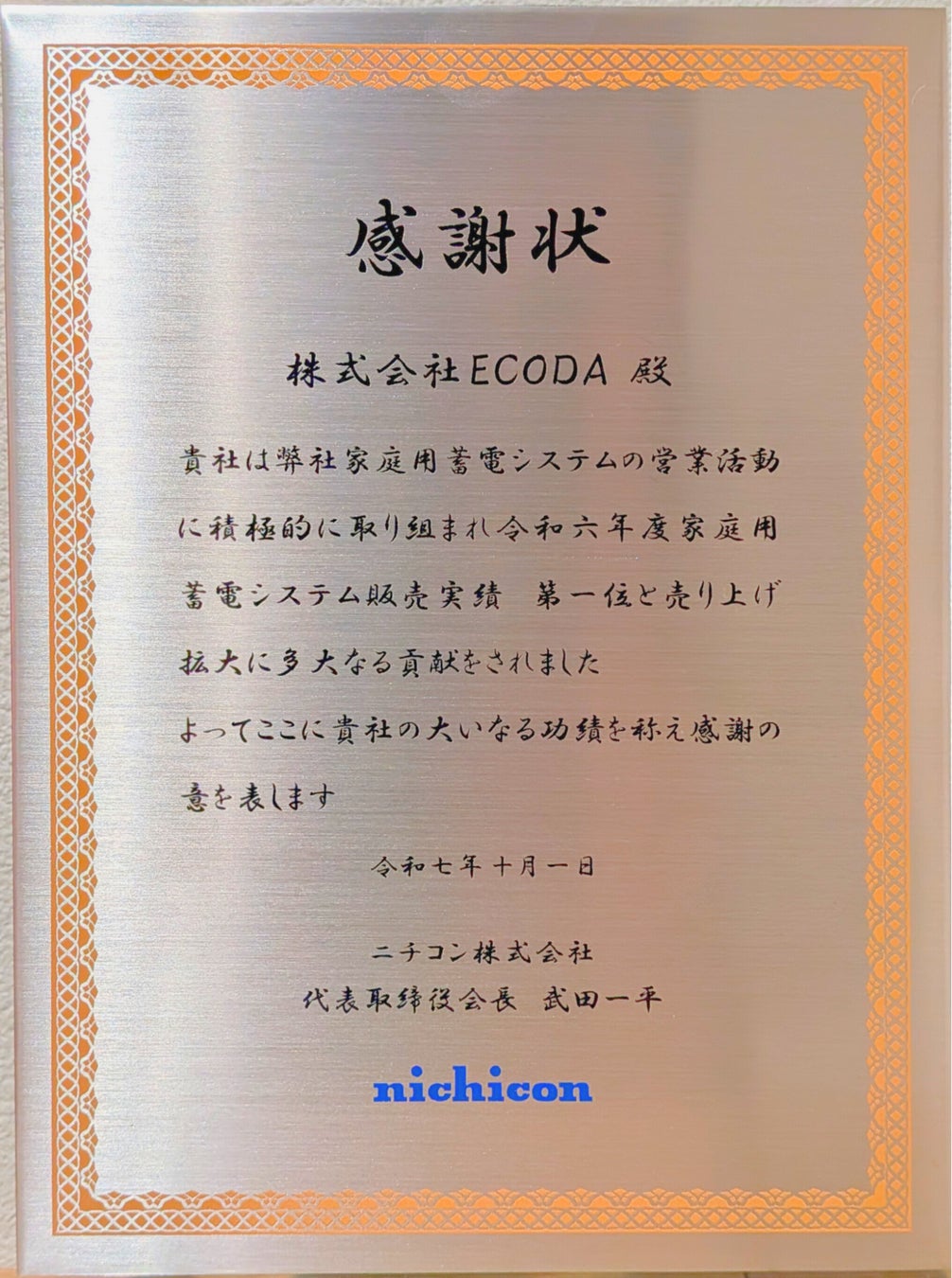 株式会社ECODA(エコダ)(本社:東京都渋谷区、代表取締役:平間 一也、https://ecoda-corp.com/)は、2025年10月1日(水)、家庭用蓄電システム分野において国内トップクラスの実績を誇るニチコン株式会社より、「家庭用蓄電システムの販売実績第一位」として感謝状を受賞いたしましたので、お知らせいたします。