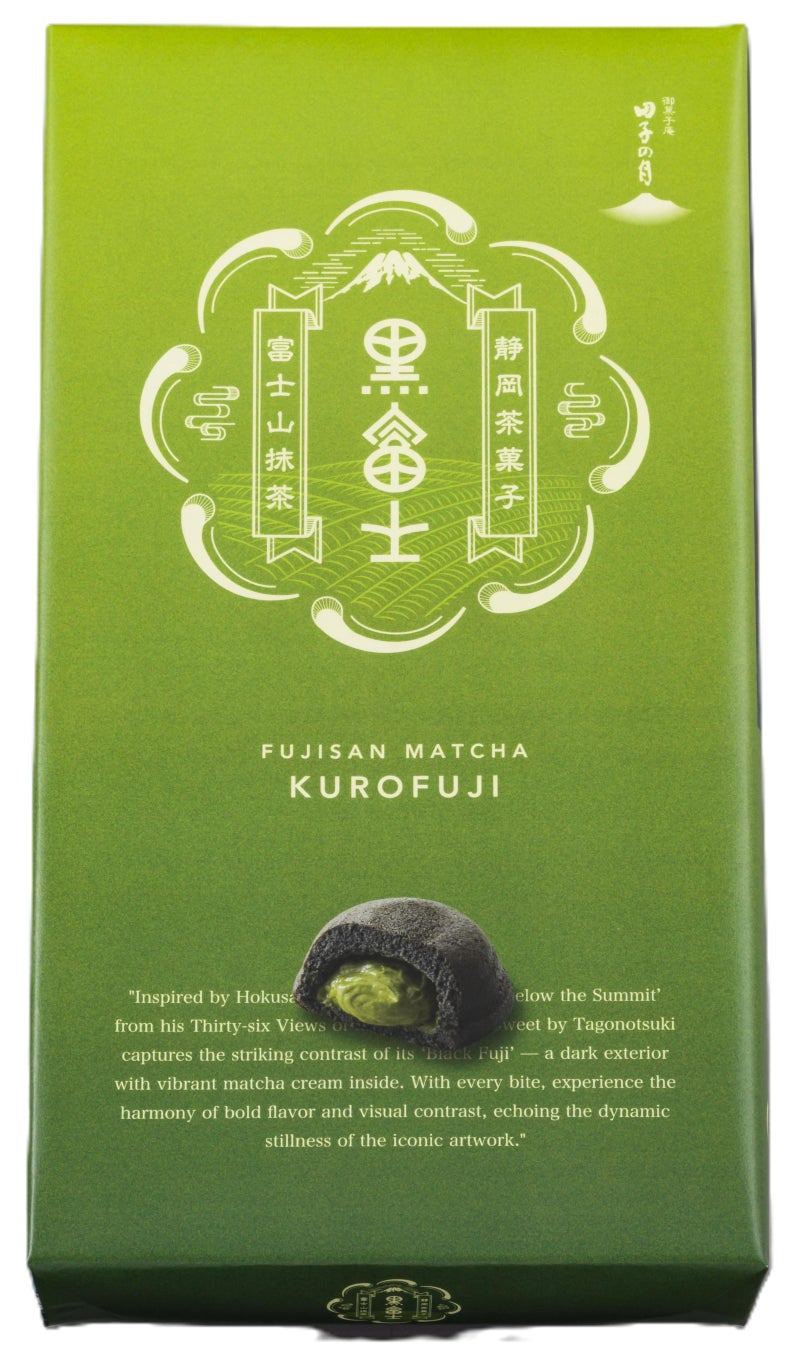 「黒富士」は浮世絵師・葛飾北斎の作品「富嶽三十六景 山下白雨」、通称「黒富士」からインスパイアされ誕生しました。中にたっぷりと詰められた濃厚な抹茶クリームには、富士市で育てられたオーガニック抹茶を贅沢に使用。皮には富士宮で採れたお茶を炭にしたお茶炭を使い、黒と緑の美しいコントラストもお楽しみいただける商品に仕上がりました。漆黒のエッジの効いた見た目とは裏腹に、繊細な抹茶の風味を感じる一品です。
