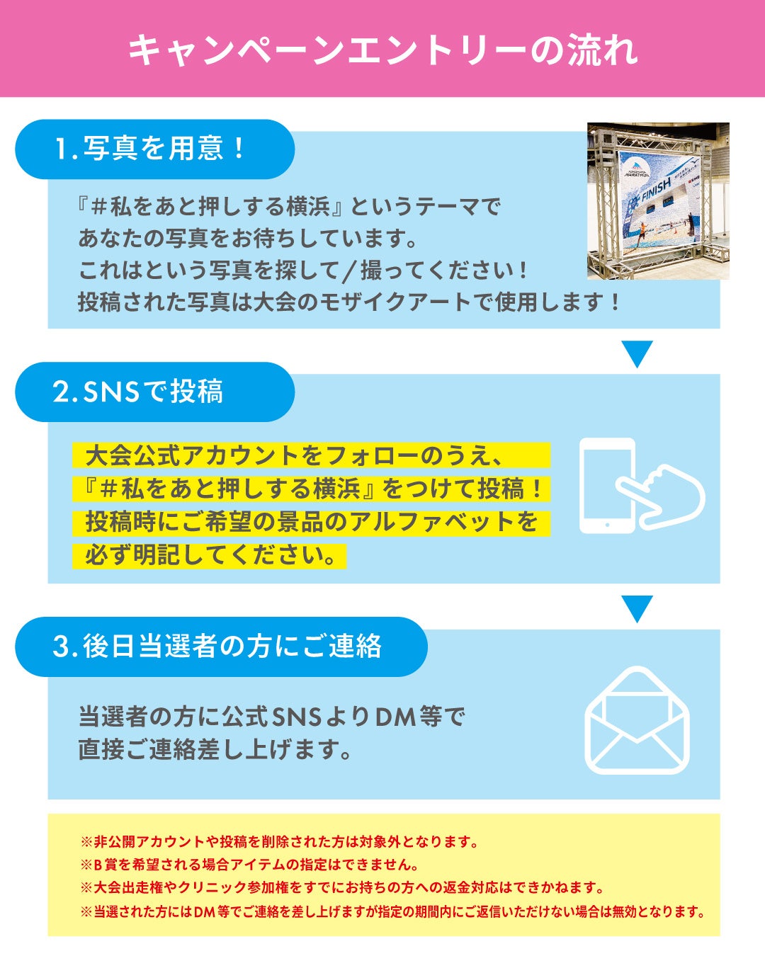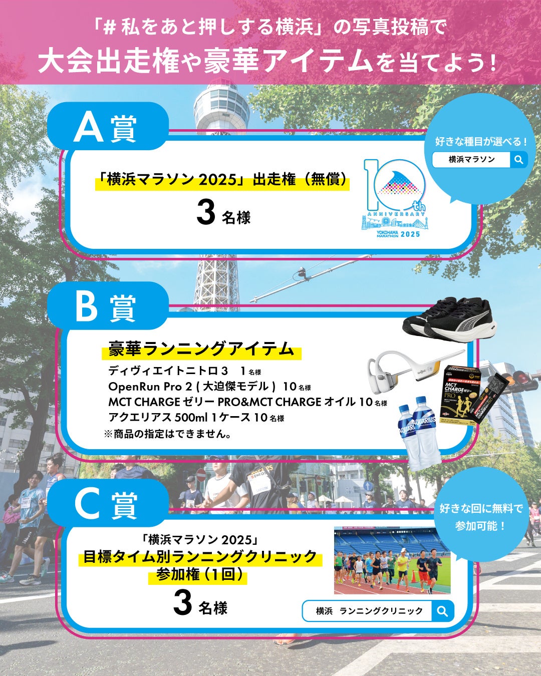 大会エントリーに合わせて、大会出走権や豪華賞品が当たるSNS投稿キャンペーン「Powered by YOKOHAMA キャンペーン」を実施中。『#私をあと押しする横浜』というテーマであなたの写真をお待ちしています。
