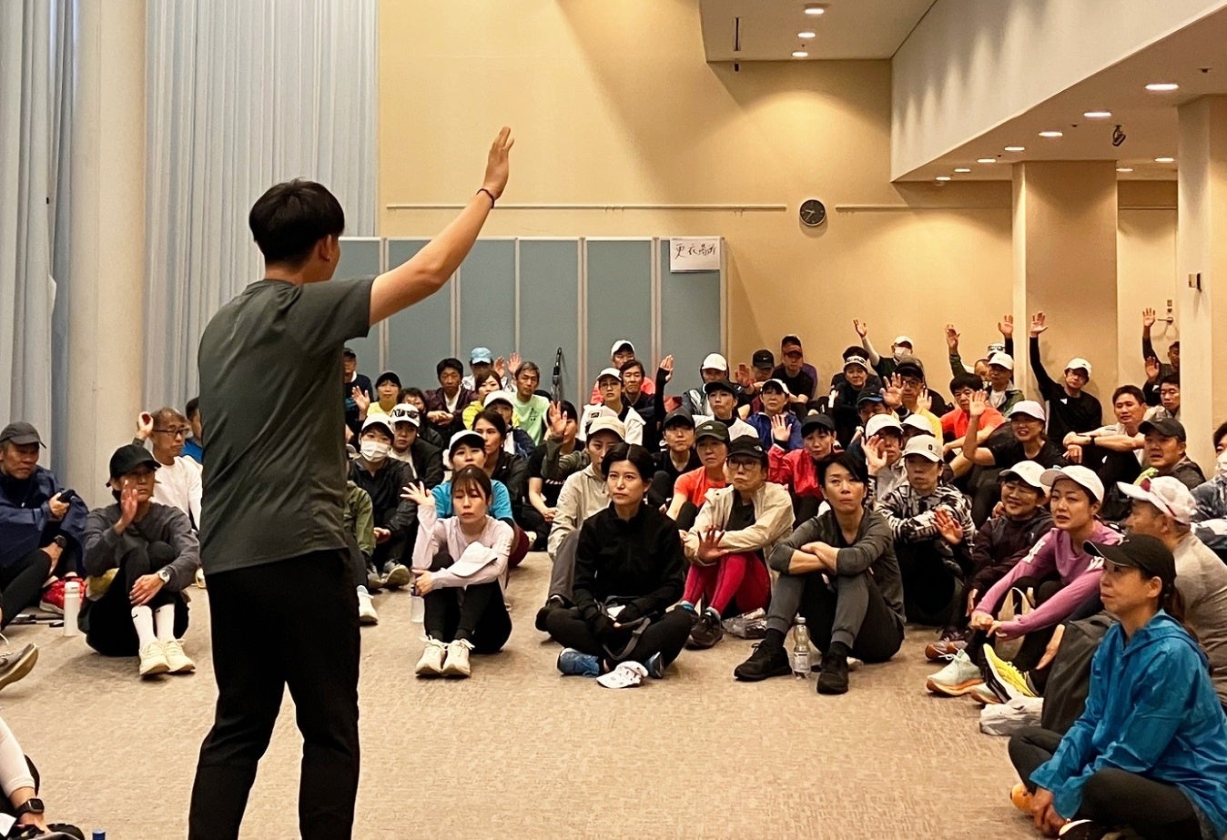 まずは座学。今回はあいにくの雨でしたが、本番が雨の場合を想定したテーマの講義も。雨によって体温が低下するとパフォーマンスが下がるため、まずは体が冷えないような対策を。そして、履き慣れたシューズは裏が滑りやすくなっていないかチェック。自身の体が雨の日にどのくらい疲労度が増すのかを知ることも大切です。